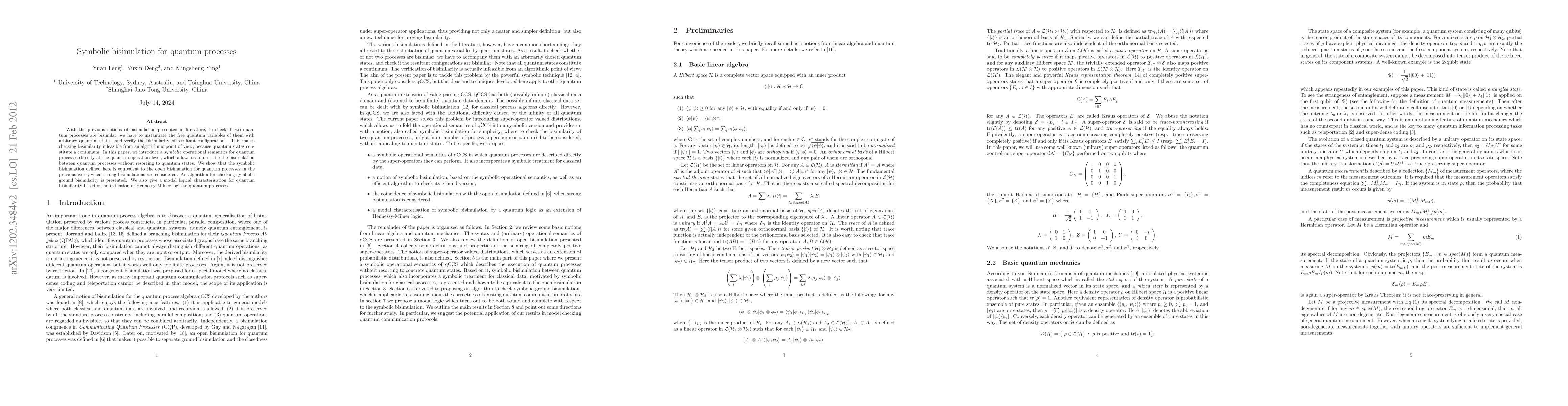 With the previous notions of bisimulation presented in literature, to check if two quantum processes are bisimilar, we have to instantiate the free quantum variables of them with arbitrary quantum states, and verify the bisimilarity of resultant configurations. This makes checking bisimilarity infeasible from an algorithmic point of view because quantum states constitute a continuum. In this paper, we introduce a symbolic operational semantics for quantum processes directly at the quantum operation level, which allows us to describe the bisimulation between quantum processes without resorting to quantum states. We show that the symbolic bisimulation defined here is equivalent to the open bisimulation for quantum processes in the previous work, when strong bisimulations are considered. An algorithm for checking symbolic ground bisimilarity is presented. We also give a modal logical characterisation for quantum bisimilarity based on an extension of Hennessy-Milner logic to quantum processes.