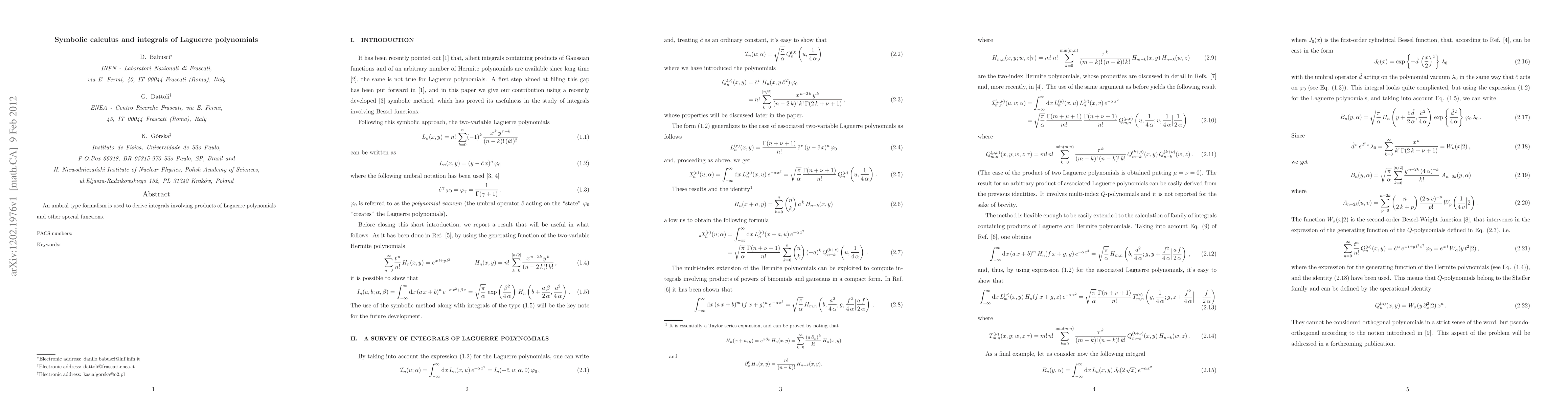 Summary: This paper employs an umbral formalism to derive integrals involving products of Laguerre polynomials and other special functions, providing a novel approach to symbolic calculus.