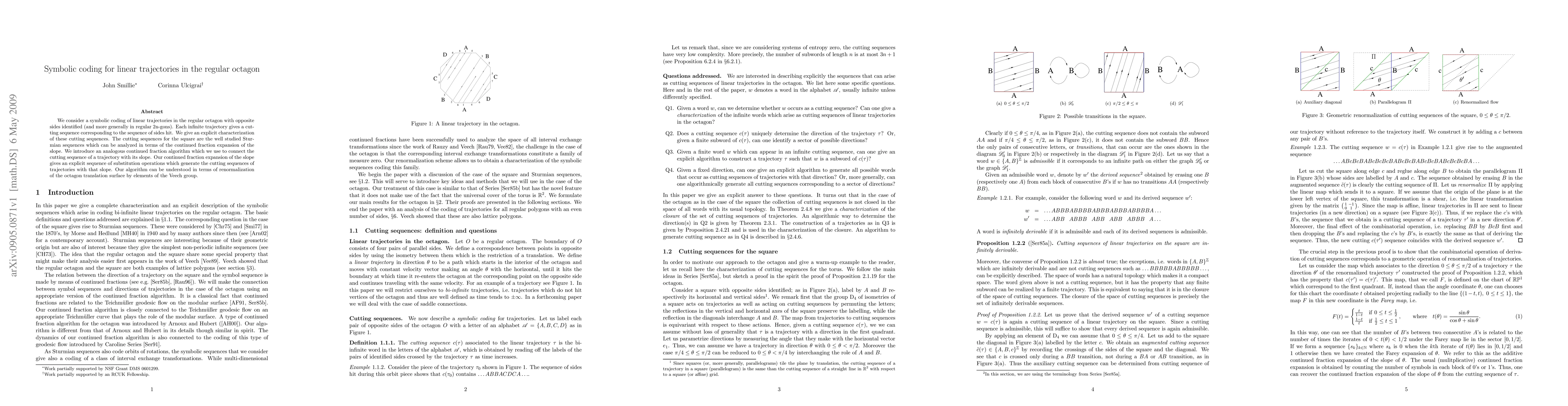 We consider a symbolic coding of linear trajectories in the regular octagon with opposite sides identified (and more generally in regular 2n-gons). Each infinite trajectory gives a cutting sequence corresponding to the sequence of sides hit. We give an explicit characterization of these cutting sequences. The cutting sequences for the square are the well studied Sturmian sequences which can be analyzed in terms of the continued fraction expansion of the slope. We introduce an analogous continued fraction algorithm which we use to connect the cutting sequence of a trajectory with its slope. Our continued fraction expansion of the slope gives an explicit sequence of substitution operations which generate the cutting sequences of trajectories with that slope. Our algorithm can be understood in terms of renormalization of the octagon translation surface by elements of the Veech group.