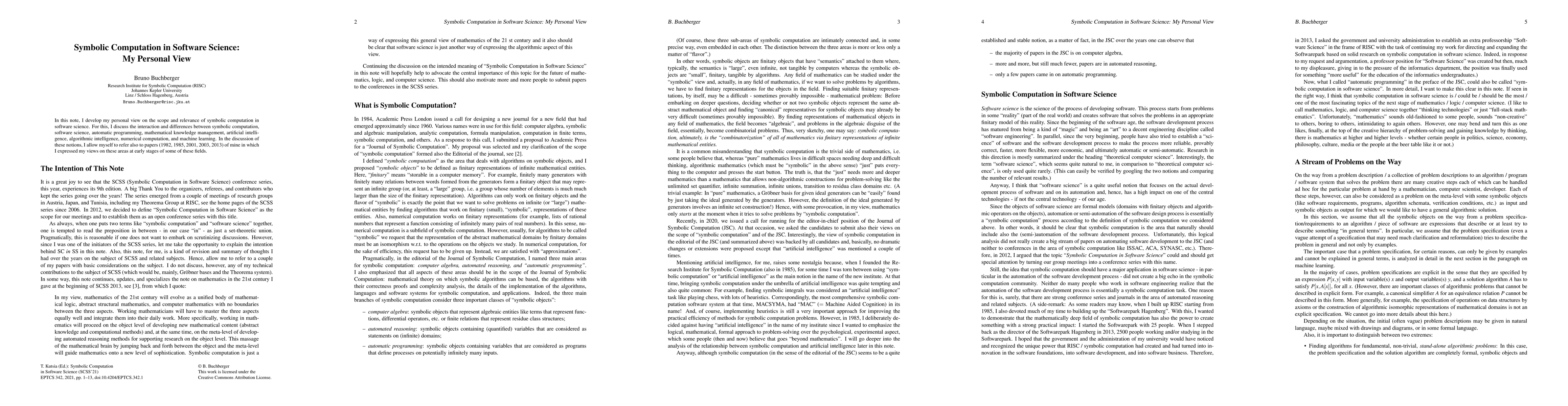 In this note, I develop my personal view on the scope and relevance of symbolic computation in software science. For this, I discuss the interaction and differences between symbolic computation, software science, automatic programming, mathematical knowledge management, artificial intelligence, algorithmic intelligence, numerical computation, and machine learning. In the discussion of these notions, I allow myself to refer also to papers (1982, 1985, 2001, 2003, 2013) of mine in which I expressed my views on these areas at early stages of some of these fields.