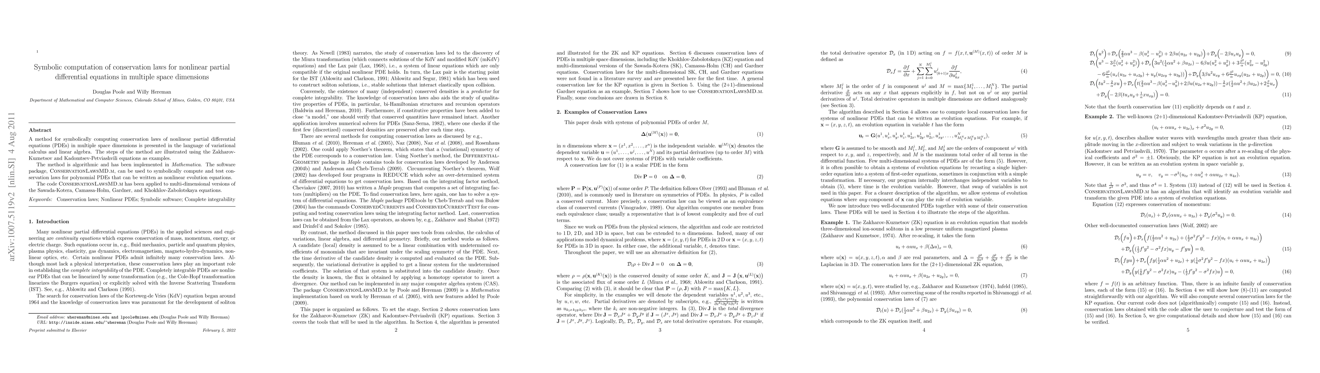 This paper introduces a symbolic computation method for conservation laws in nonlinear partial differential equations across multiple space dimensions, using variational calculus and linear algebra. The method, implemented in Mathematica as ConservationLawsMD.m, has been tested on various equations like Zakharov-Kuznetsov, Kadomtsev-Petviashvili, Sawada-Kotera, Camassa-Holm, Gardner, and Khokhlov-Zabolotskaya, demonstrating its applicability to (2+1)-dimensional equations.