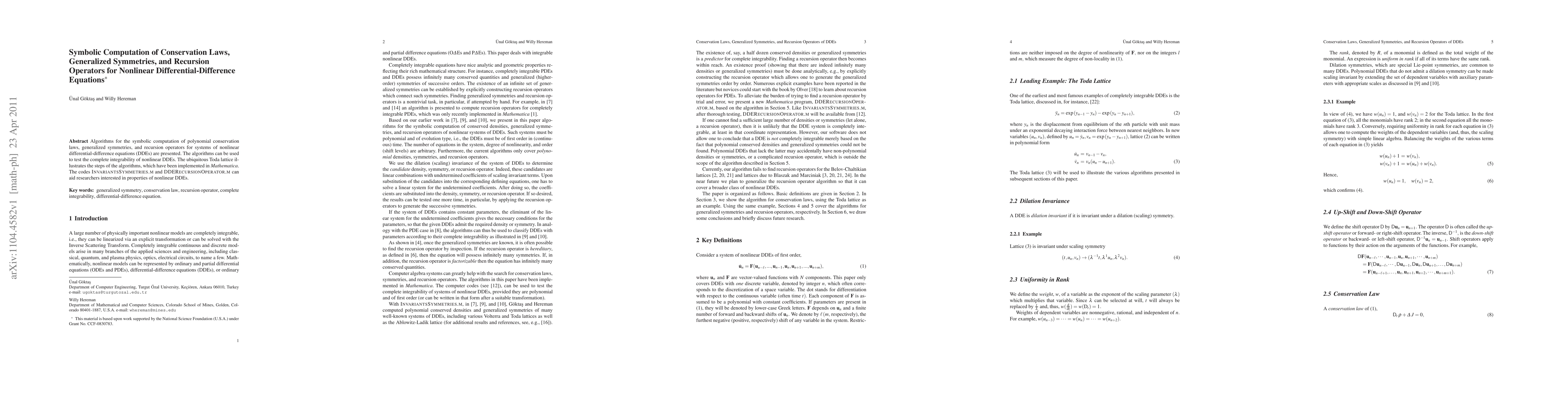 This paper presents algorithms for symbolically computing conservation laws, generalized symmetries, and recursion operators for nonlinear differential-difference equations (DDEs). The algorithms are demonstrated using the Toda lattice and implemented in Mathematica, providing tools for testing the complete integrability of nonlinear DDEs.