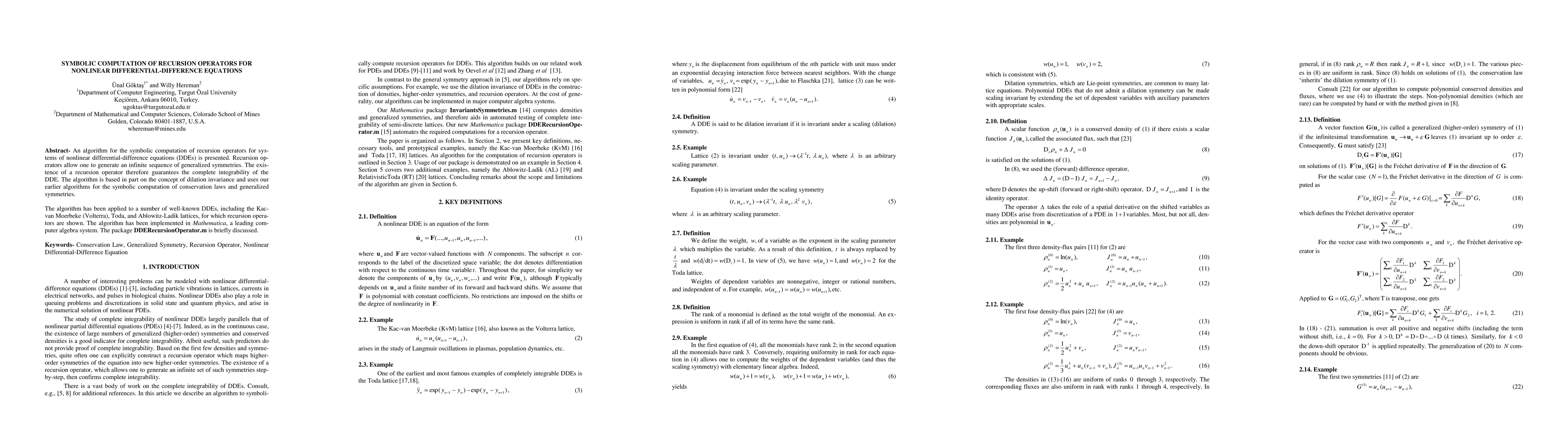 This paper presents an algorithm for symbolically computing recursion operators for nonlinear differential-difference equations (DDEs), which ensures the complete integrability of DDEs. The algorithm leverages dilation invariance and prior methods for conservation laws and symmetries, and has been implemented in Mathematica to demonstrate its effectiveness on known DDE systems like the Kac-van Moerbeke, Toda, and Ablowitz-Ladik lattices.