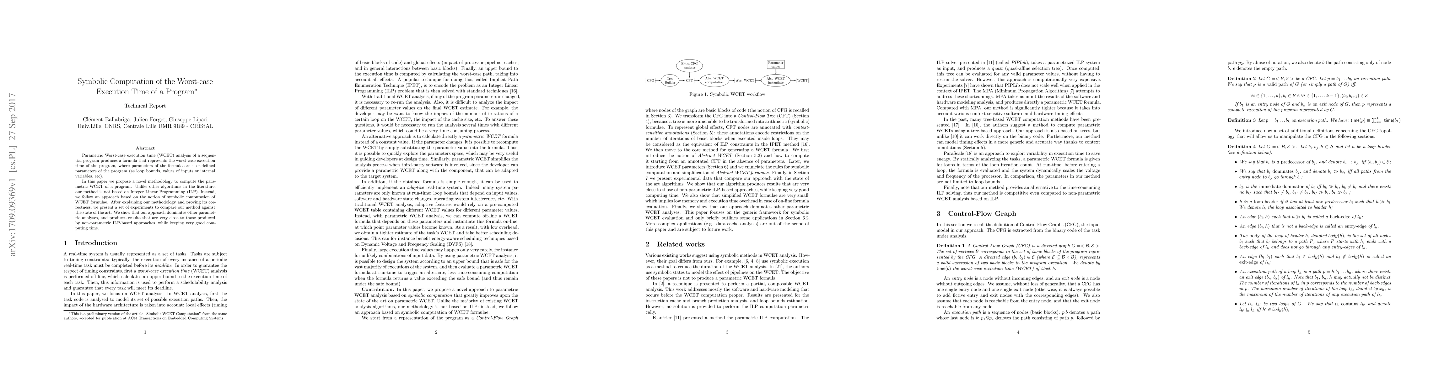 This paper proposes a novel symbolic computation methodology for parametric worst-case execution time (WCET) analysis of sequential programs, diverging from traditional Integer Linear Programming (ILP) approaches. The method's correctness is proven, and experimental results show it outperforms other parametric analyses while maintaining efficient computation times.