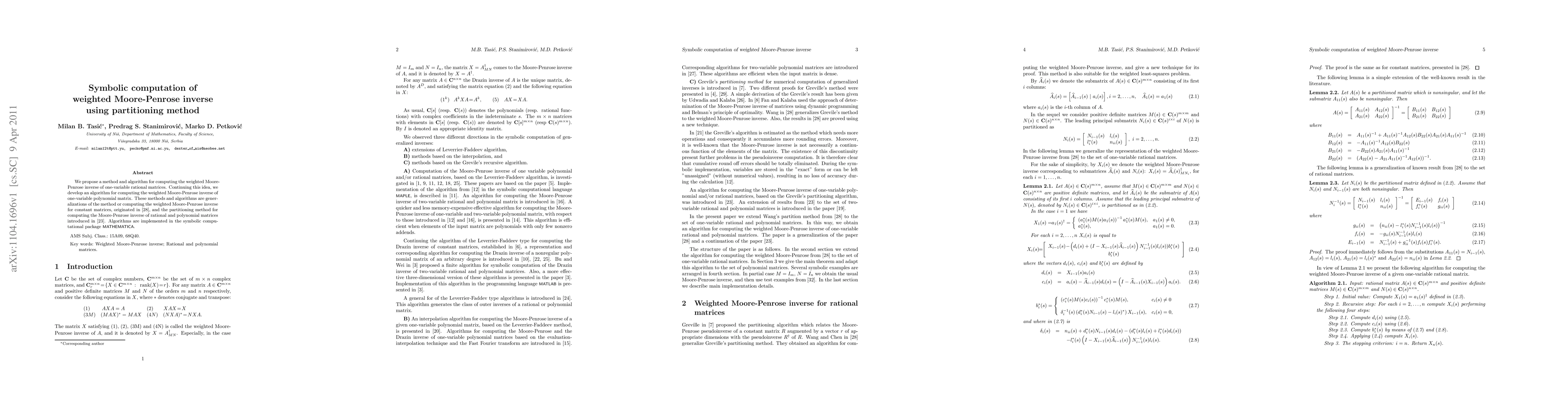 This paper introduces an algorithm for computing the weighted Moore-Penrose inverse of one-variable rational and polynomial matrices, based on a partitioning method and generalizing previous methods for constant matrices. The algorithms are implemented in MATHEMATICA.