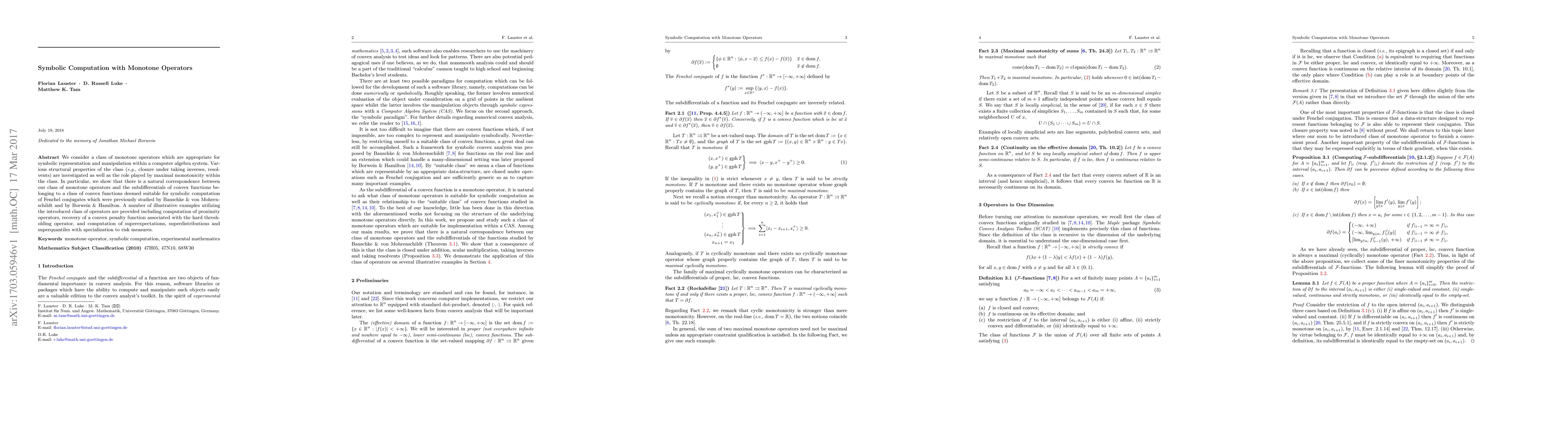 This paper explores a class of monotone operators suitable for symbolic computation in computer algebra systems, investigating their structural properties and correspondence with convex functions' subdifferentials. It demonstrates applications in computing proximity operators, recovering penalty functions, and calculating risk measures.