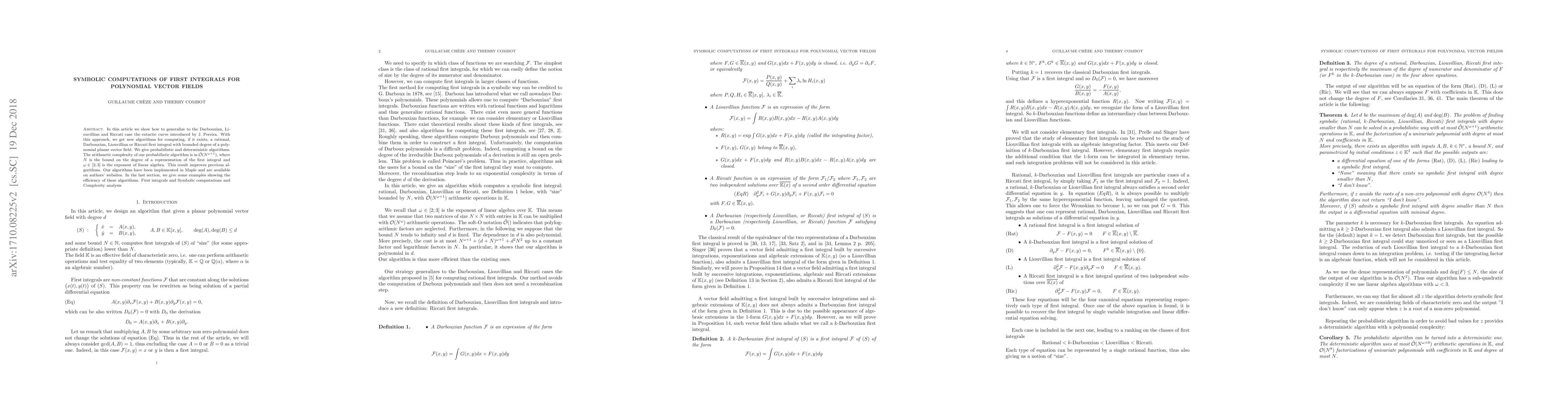 In this article we show how to generalize to the Darbouxian, Liouvillian and Riccati case the extactic curve introduced by J. Pereira. With this approach, we get new algorithms for computing, if it exists, a rational, Darbouxian, Liouvillian or Riccati first integral with bounded degree of a polynomial planar vector field. We give probabilistic and deterministic algorithms. The arithmetic complexity of our probabilistic algorithm is in $\tilde{\mathcal{O}}(N^{\omega+1})$, where $N$ is the bound on the degree of a representation of the first integral and $\omega \in [2;3]$ is the exponent of linear algebra. This result improves previous algorithms. Our algorithms have been implemented in Maple and are available on authors' websites. In the last section, we give some examples showing the efficiency of these algorithms.