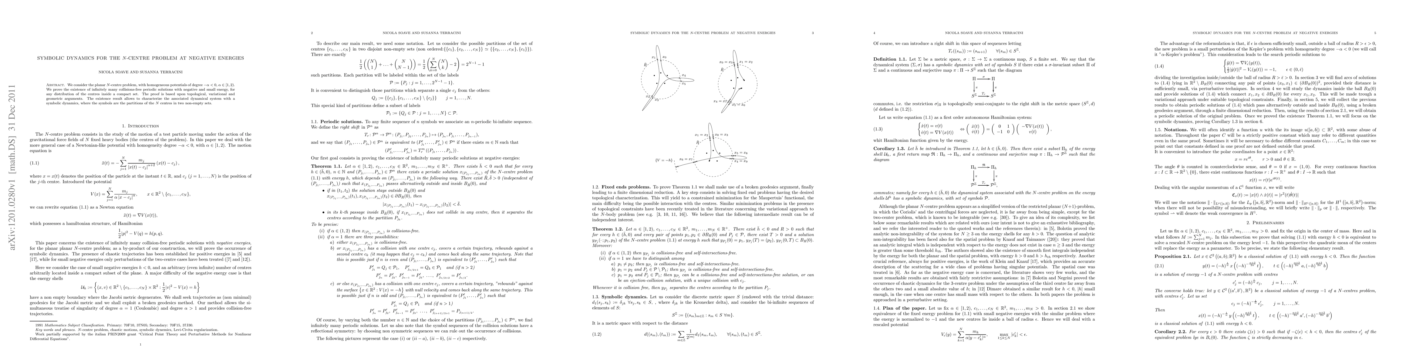 We consider the planar $N$-centre problem, with homogeneous potentials of degree $-\a<0$, $\a \in [1,2)$. We prove the existence of infinitely many collisions-free periodic solutions with negative and small energy, for any distribution of the centres inside a compact set. The proof is based upon topological, variational and geometric arguments. The existence result allows to characterize the associated dynamical system with a symbolic dynamics, where the symbols are the partitions of the $N$ centres in two non-empty sets.