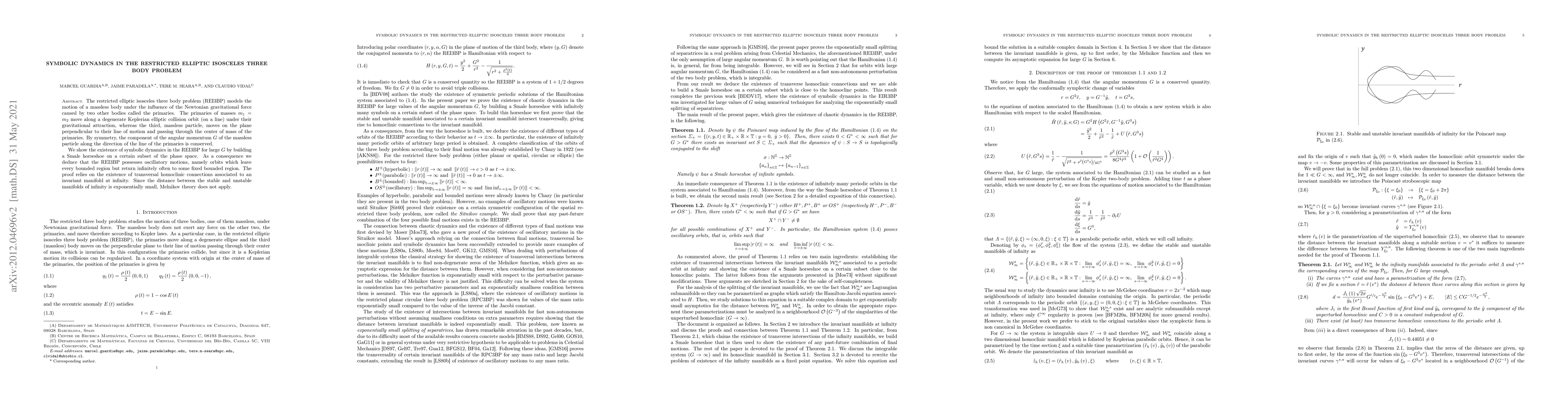 This paper demonstrates the existence of symbolic dynamics in the elliptic isosceles restricted three body problem (REI3BP) for large angular momentum, constructing a Smale horseshoe to show oscillatory motions. The study reveals complex, infinitely recurrent orbits despite the failure of Melnikov theory due to exponentially small distances between stable and unstable manifolds.