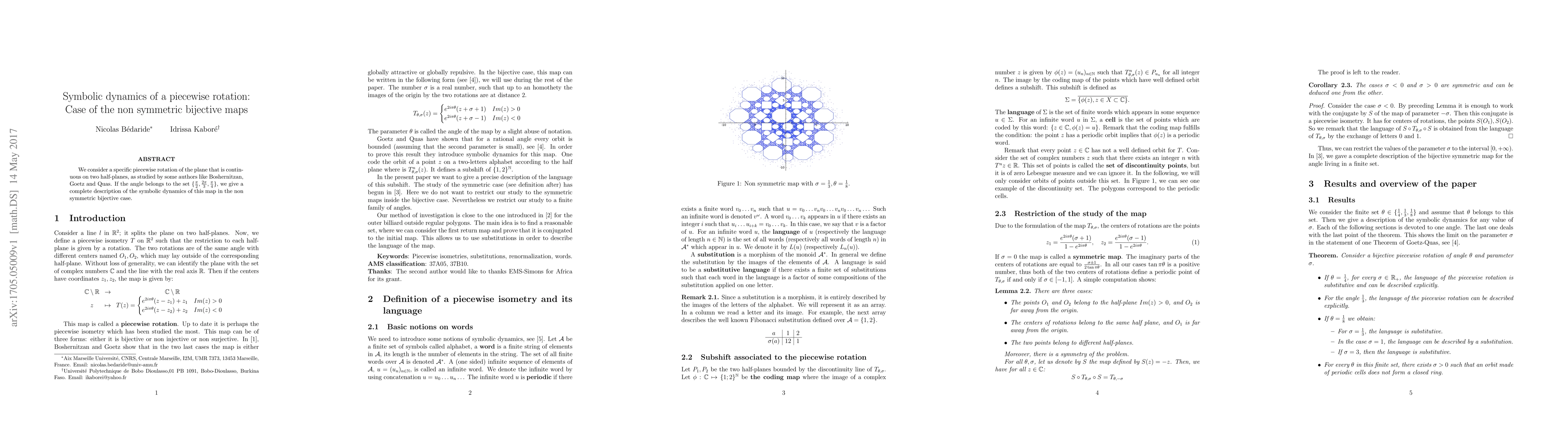 We consider a specific piecewise rotation of the plane that is continuous on two half-planes, as studied by some authors like Boshernitzan, Goetz and Quas. If the angle belongs to the set $\{\frac{\pi}{2},\frac{2\pi}{3},\frac{\pi}{4}\}$, we give a complete description of the symbolic dynamics of this map in the non symmetric bijective case.