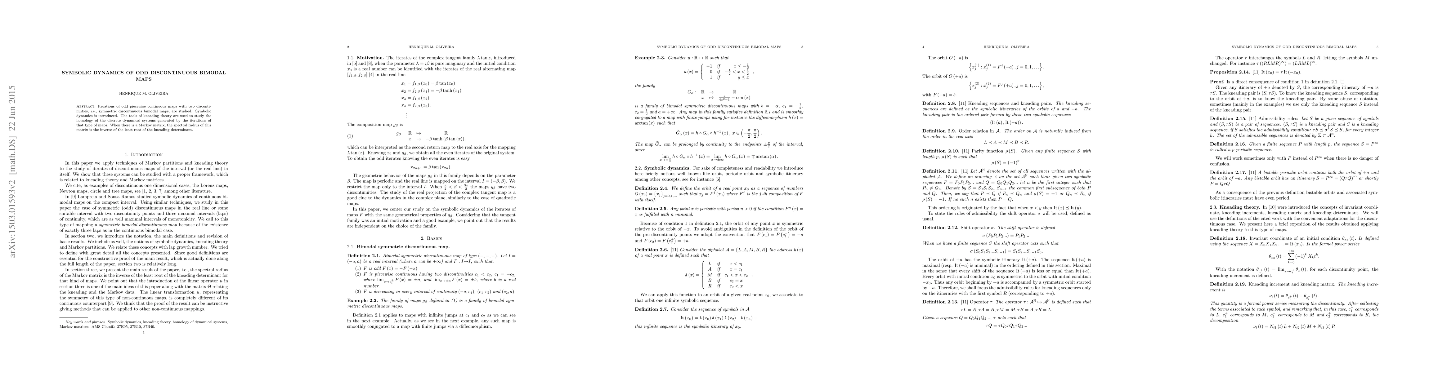 This paper explores the symbolic dynamics of odd discontinuous bimodal maps, employing kneading theory to analyze the homology of the resulting dynamical systems. It finds that when a Markov matrix exists, the spectral radius is the inverse of the least root of the kneading determinant.