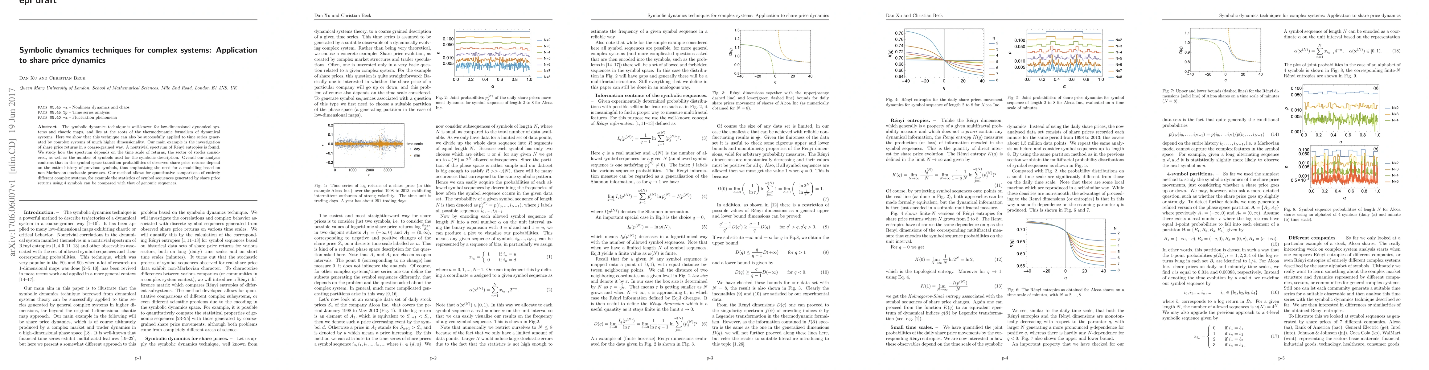 The symbolic dynamics technique is well-known for low-dimensional dynamical systems and chaotic maps, and lies at the roots of the thermodynamic formalism of dynamical systems. Here we show that this technique can also be successfully applied to time series generated by complex systems of much higher dimensionality. Our main example is the investigation of share price returns in a coarse-grained way. A nontrivial spectrum of Renyi entropies is found. We study how the spectrum depends on the time scale of returns, the sector of stocks considered, as well as the number of symbols used for the symbolic description. Overall our analysis confirms that in the symbol space transition probabilities of observed share price returns depend on the entire history of previous symbols, thus emphasizing the need for a modelling based on non-Markovian stochastic processes. Our method allows for quantitative comparisons of entirely different complex systems, for example the statistics of symbol sequences generated by share price returns using 4 symbols can be compared with that of genomic sequences.