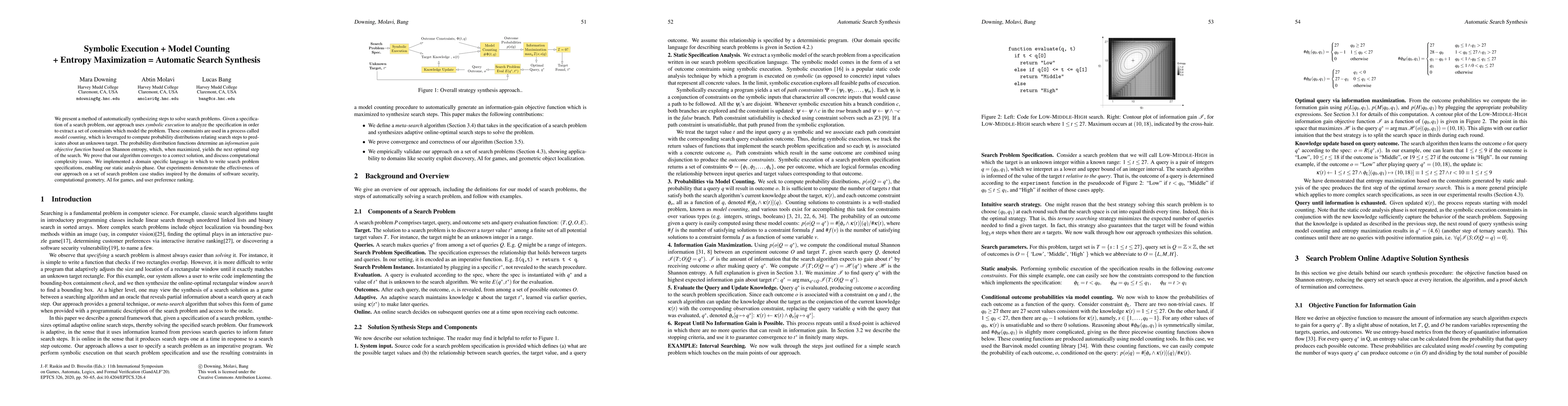We present a method of automatically synthesizing steps to solve search problems. Given a specification of a search problem, our approach uses symbolic execution to analyze the specification in order to extract a set of constraints which model the problem. These constraints are used in a process called model counting, which is leveraged to compute probability distributions relating search steps to predicates about an unknown target. The probability distribution functions determine an information gain objective function based on Shannon entropy, which, when maximized, yields the next optimal step of the search. We prove that our algorithm converges to a correct solution, and discuss computational complexity issues. We implemented a domain specific language in which to write search problem specifications, enabling our static analysis phase. Our experiments demonstrate the effectiveness of our approach on a set of search problem case studies inspired by the domains of software security, computational geometry, AI for games, and user preference ranking.