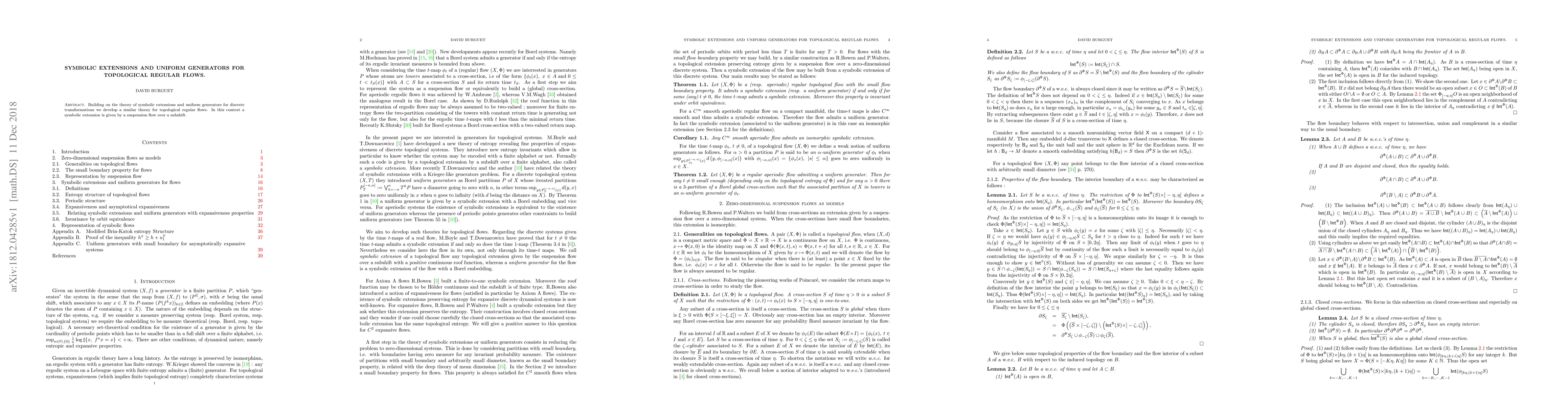 Researchers develop a theory for topological regular flows by extending existing concepts of symbolic extensions and uniform generators to this new context, enabling a deeper understanding of their behavior and properties.