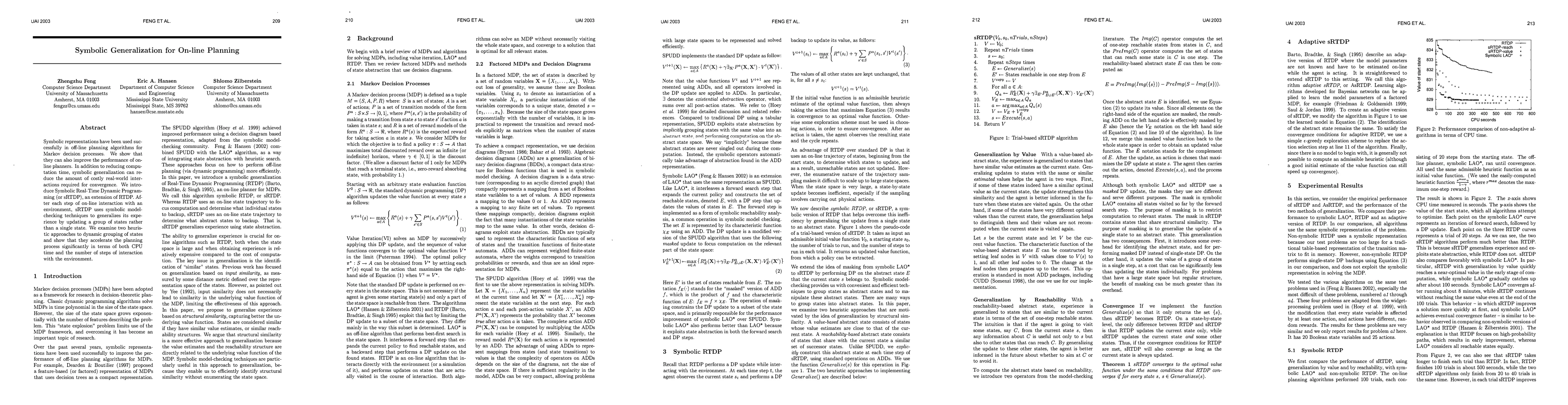 This paper proposes Symbolic Real-Time Dynamic Programming (sRTDP) to enhance on-line planning efficiency by using symbolic generalization. It demonstrates that sRTDP reduces computation time and real-world interactions through dynamic grouping of states, significantly accelerating the planning process.