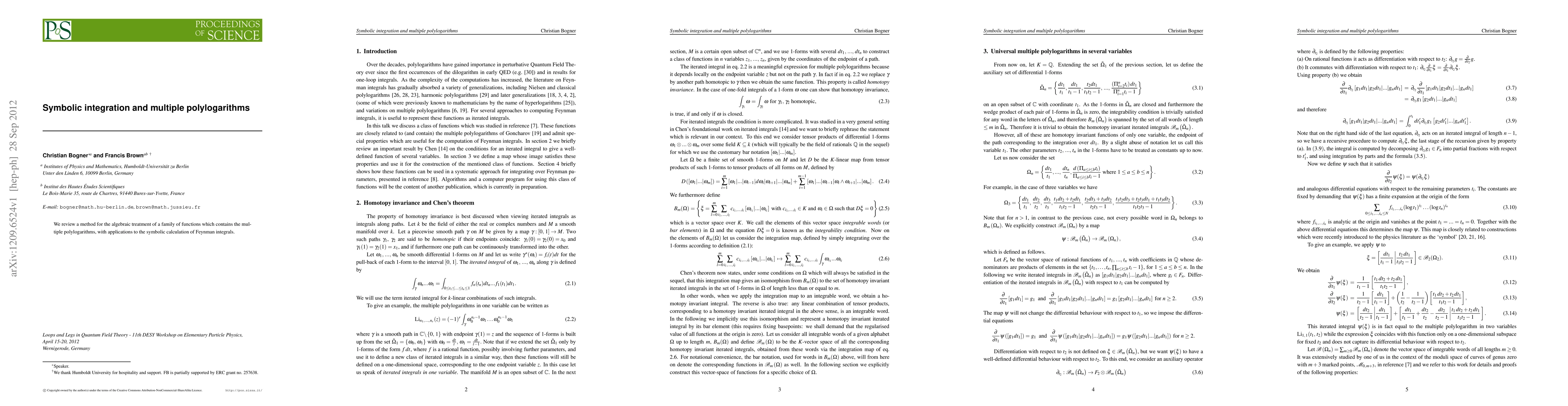 Summary: This paper explores an algebraic method for handling multiple polylogarithms, offering applications to the symbolic computation of Feynman integrals in quantum field theory. The technique simplifies complex integrals through symbolic integration.