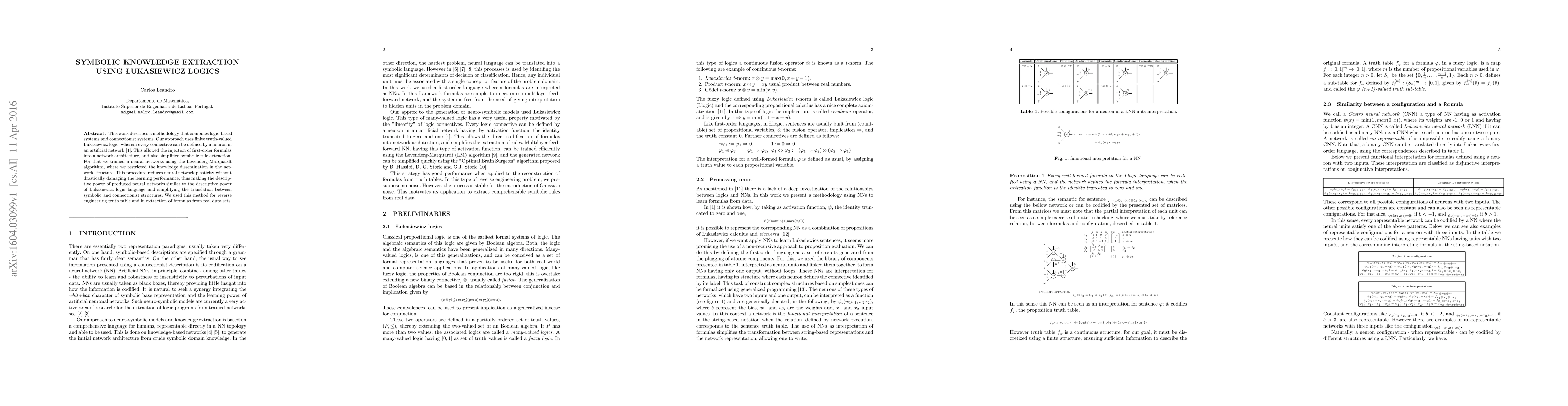 This work describes a methodology that combines logic-based systems and connectionist systems. Our approach uses finite truth-valued {\L}ukasiewicz logic, wherein every connective can be defined by a neuron in an artificial network. This allowed the injection of first-order formulas into a network architecture, and also simplified symbolic rule extraction. For that we trained a neural networks using the Levenderg-Marquardt algorithm, where we restricted the knowledge dissemination in the network structure. This procedure reduces neural network plasticity without drastically damaging the learning performance, thus making the descriptive power of produced neural networks similar to the descriptive power of {\L}ukasiewicz logic language and simplifying the translation between symbolic and connectionist structures. We used this method for reverse engineering truth table and in extraction of formulas from real data sets.