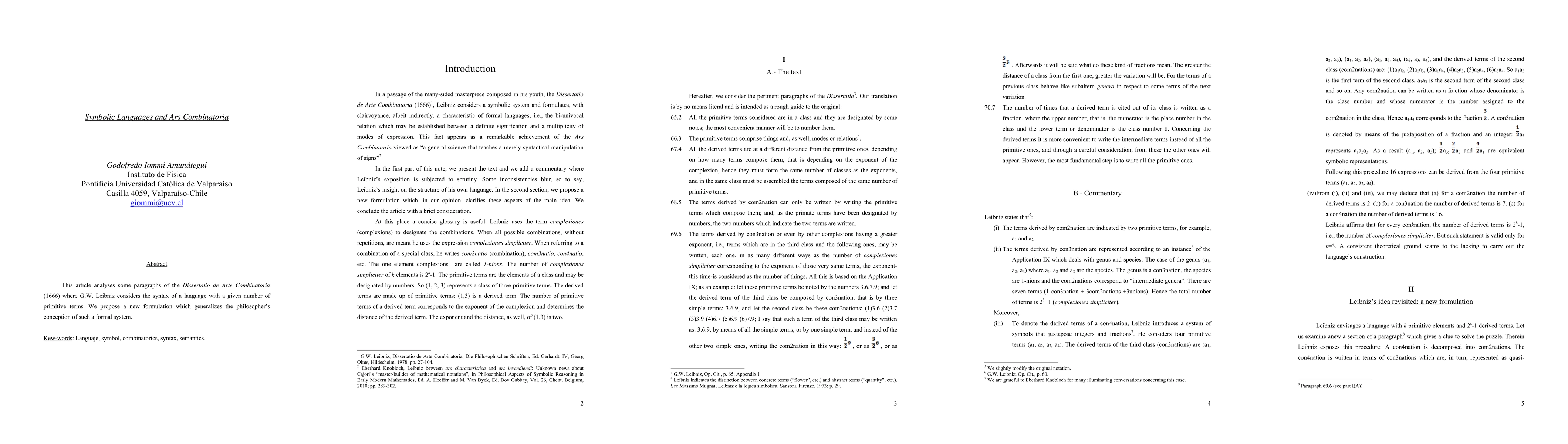 This article analyses some paragraphs of the Dissertatio de Arte Combinatoria (1666) where G.W. Leibniz considers the syntax of a language with a given number of primitive terms. We propose a new formulation which generalizes the philosopher conception of such a formal system.