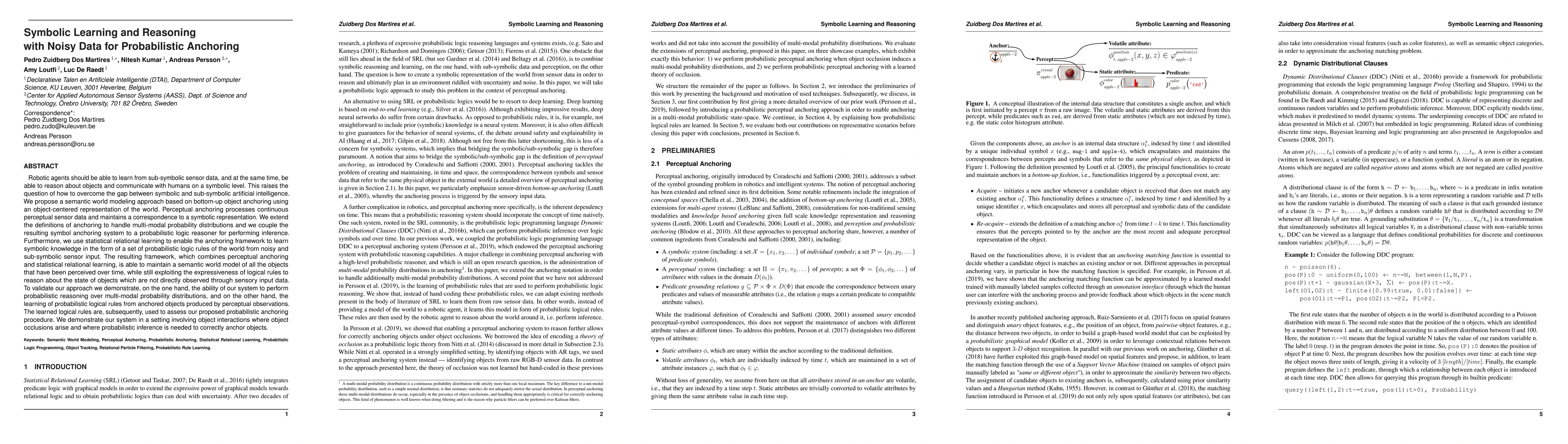 Robotic agents should be able to learn from sub-symbolic sensor data, and at the same time, be able to reason about objects and communicate with humans on a symbolic level. This raises the question of how to overcome the gap between symbolic and sub-symbolic artificial intelligence. We propose a semantic world modeling approach based on bottom-up object anchoring using an object-centered representation of the world. Perceptual anchoring processes continuous perceptual sensor data and maintains a correspondence to a symbolic representation. We extend the definitions of anchoring to handle multi-modal probability distributions and we couple the resulting symbol anchoring system to a probabilistic logic reasoner for performing inference. Furthermore, we use statistical relational learning to enable the anchoring framework to learn symbolic knowledge in the form of a set of probabilistic logic rules of the world from noisy and sub-symbolic sensor input. The resulting framework, which combines perceptual anchoring and statistical relational learning, is able to maintain a semantic world model of all the objects that have been perceived over time, while still exploiting the expressiveness of logical rules to reason about the state of objects which are not directly observed through sensory input data. To validate our approach we demonstrate, on the one hand, the ability of our system to perform probabilistic reasoning over multi-modal probability distributions, and on the other hand, the learning of probabilistic logical rules from anchored objects produced by perceptual observations. The learned logical rules are, subsequently, used to assess our proposed probabilistic anchoring procedure. We demonstrate our system in a setting involving object interactions where object occlusions arise and where probabilistic inference is needed to correctly anchor objects.
