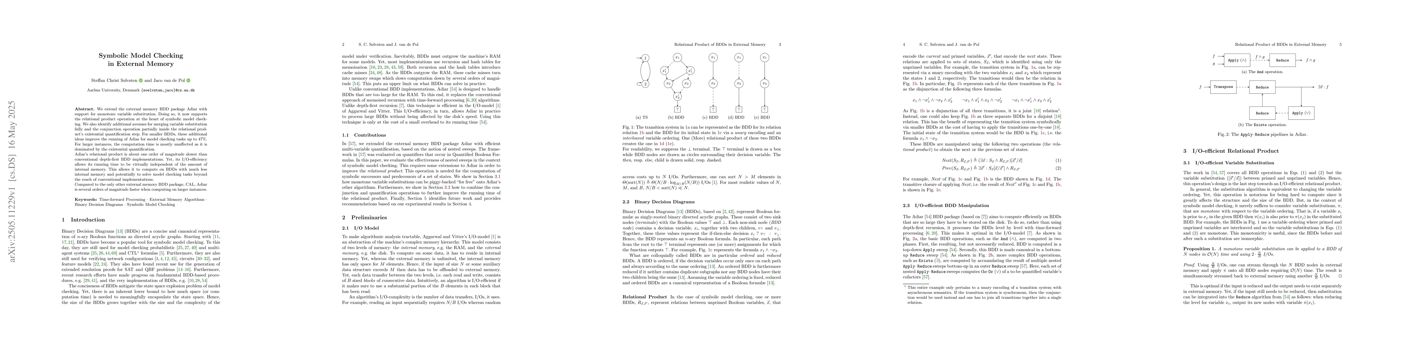 The research extends the external memory BDD package Adiar to support monotone variable substitution, enabling the relational product operation crucial for symbolic model checking. It also explores merging variable substitution fully and conjunction operation partially inside the relational product's existential quantification step.