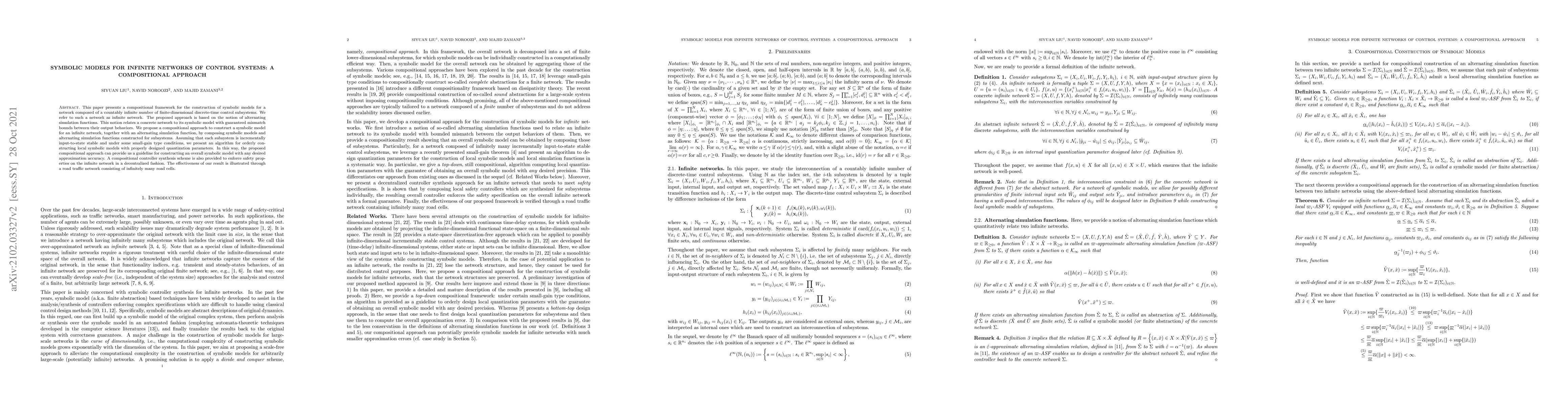 This paper introduces a compositional framework for constructing symbolic models of infinite networks of control systems, using alternating simulation functions to ensure output behavior accuracy. The approach synthesizes local symbolic models and controllers for decentralized safety enforcement, demonstrated through a road traffic network example.