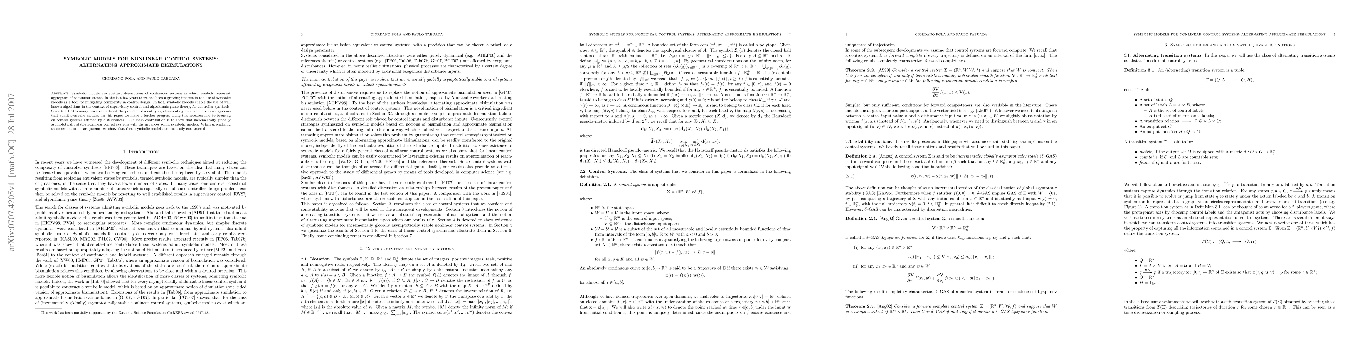 This paper explores the use of symbolic models for nonlinear control systems, demonstrating that incrementally globally asymptotically stable nonlinear systems with disturbances can be represented by such models. For linear systems, it shows that these symbolic models can be efficiently constructed.