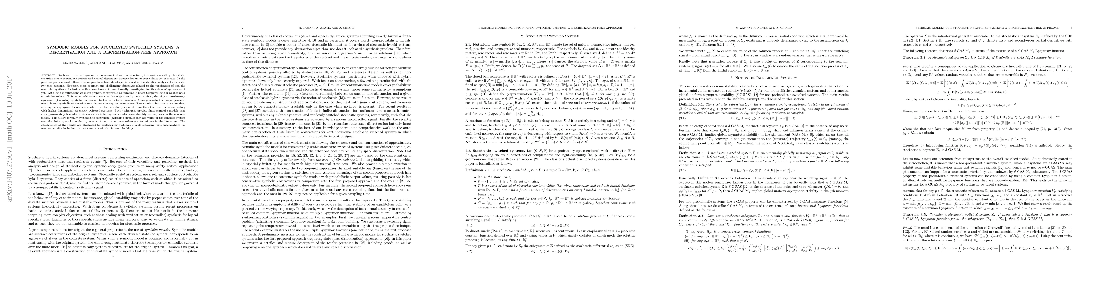 This paper introduces two symbolic abstraction techniques for analyzing stochastic switched systems: one based on state space discretization and another that avoids discretization, potentially offering higher efficiency. Both methods yield finite symbolic models that are approximately bisimilar to the original systems, enabling controller synthesis for logic specifications, demonstrated through temperature control in a six-room building.