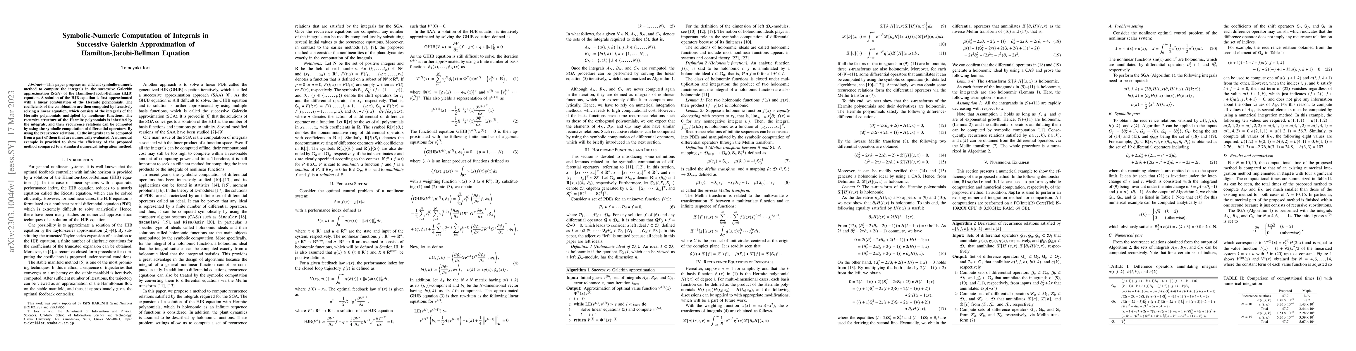 This paper proposes an efficient symbolic-numeric method to compute the integrals in the successive Galerkin approximation (SGA) of the Hamilton-Jacobi-Bellman (HJB) equation. A solution of the HJB equation is first approximated with a linear combination of the Hermite polynomials. The coefficients of the combination are then computed by iteratively solving a linear equation, which consists of the integrals of the Hermite polynomials multiplied by nonlinear functions. The recursive structure of the Hermite polynomials is inherited by the integrals, and their recurrence relations can be computed by using the symbolic computation of differential operators. By using the recurrence relations, all the integrals can be computed from a part of them that are numerically evaluated. A numerical example is provided to show the efficiency of the proposed method compared to a standard numerical integration method.