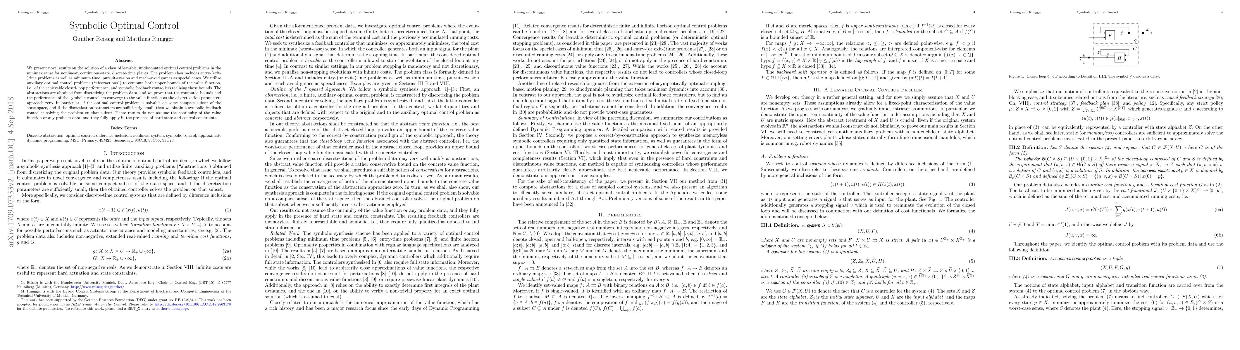 We present novel results on the solution of a class of leavable, undiscounted optimal control problems in the minimax sense for nonlinear, continuous-state, discrete-time plants. The problem class includes entry-(exit-)time problems as well as minimum time, pursuit-evasion and reach-avoid games as special cases. We utilize auxiliary optimal control problems (`abstractions') to compute both upper bounds of the value function, i.e., of the achievable closed-loop performance, and symbolic feedback controllers realizing those bounds. The abstractions are obtained from discretizing the problem data, and we prove that the computed bounds and the performance of the symbolic controllers converge to the value function as the discretization parameters approach zero. In particular, if the optimal control problem is solvable on some compact subset of the state space, and if the discretization parameters are sufficiently small, then we obtain a symbolic feedback controller solving the problem on that subset. These results do not assume the continuity of the value function or any problem data, and they fully apply in the presence of hard state and control constraints.