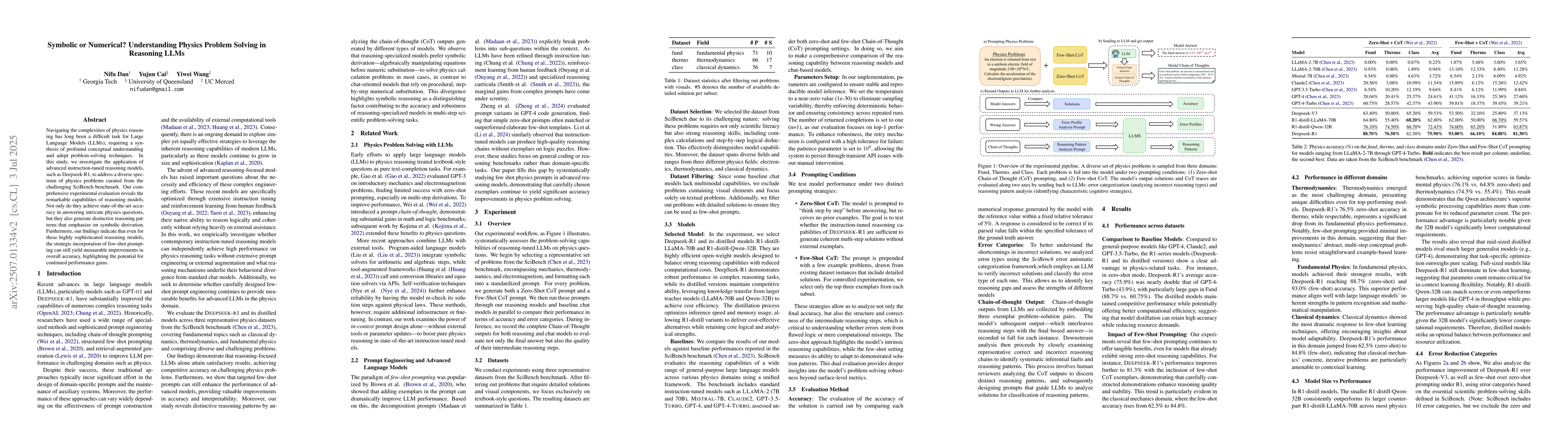 This study investigates the capabilities of advanced reasoning-focused large language models (LLMs), specifically DEEPSEEK-R1 and its distilled variants, in solving complex physics problems using the SciBench benchmark. It evaluates both zero-shot and few-shot Chain-of-Thought (CoT) prompting strategies.
