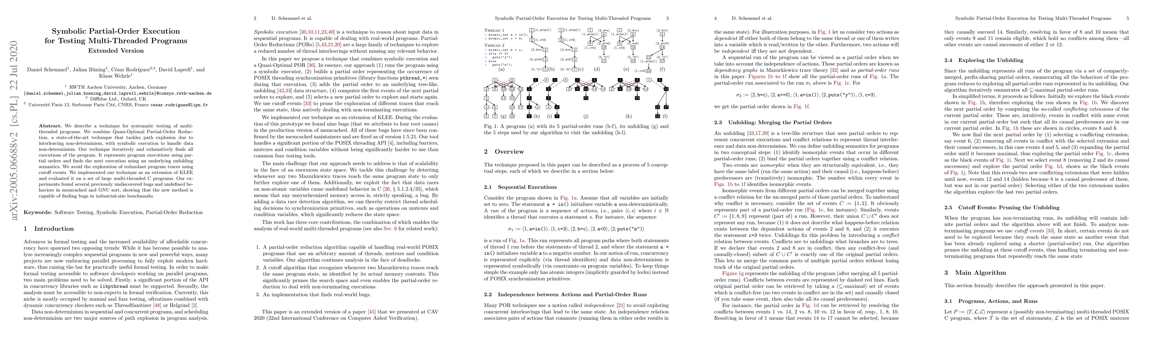 This paper presents a novel technique combining Quasi-Optimal Partial-Order Reduction with symbolic execution to systematically test multi-threaded programs. The method exhaustively finds all program executions while avoiding redundant traces, and was successfully implemented and tested on large multi-threaded C programs, uncovering several bugs in memcached and GNU sort.