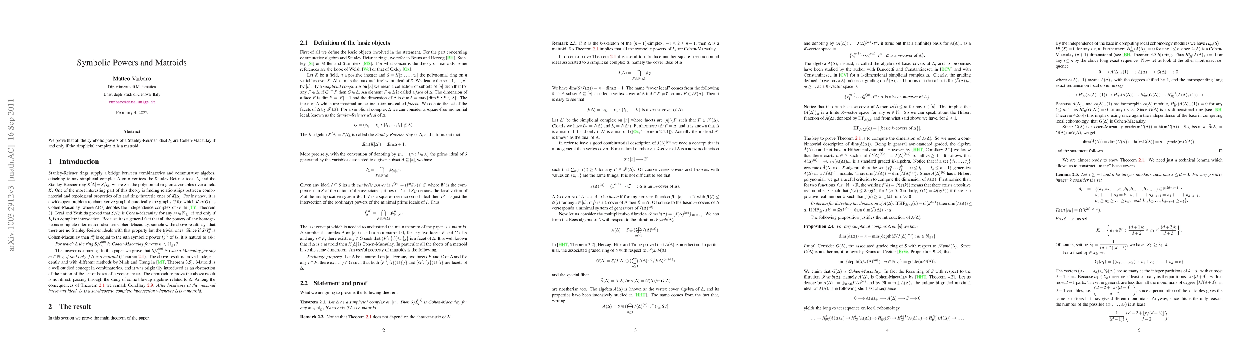 This paper proves a connection between symbolic powers of Stanley-Reisner ideals and matroids, showing that an ideal is Cohen-Macaulay if its associated complex is a matroid.