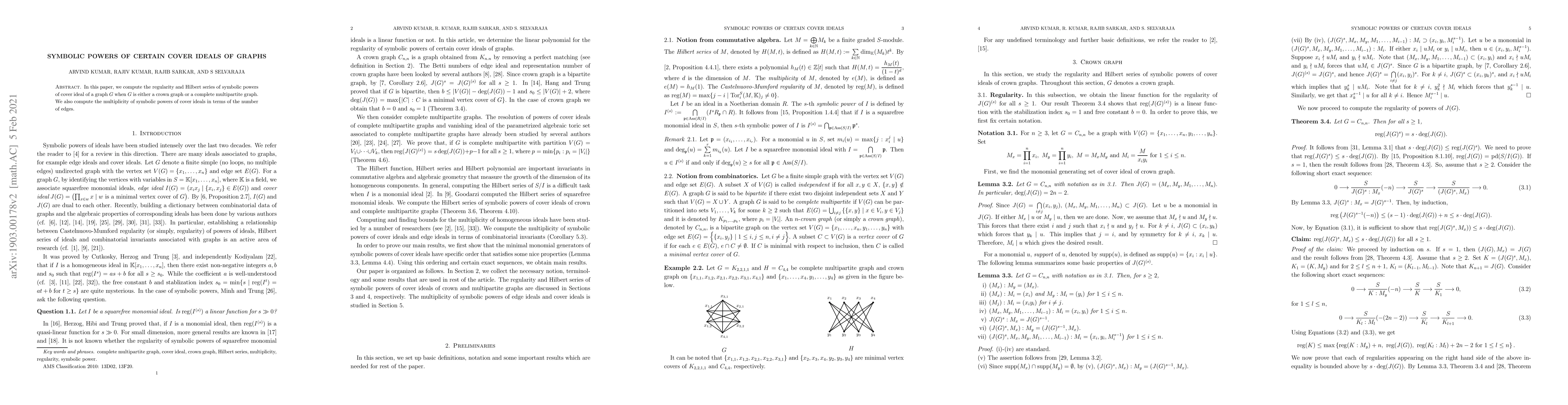 The paper computes symbolic powers of cover ideals of graphs, specifically crown and complete multipartite graphs, determining their regularity, Hilbert series, and multiplicity in terms of graph parameters.