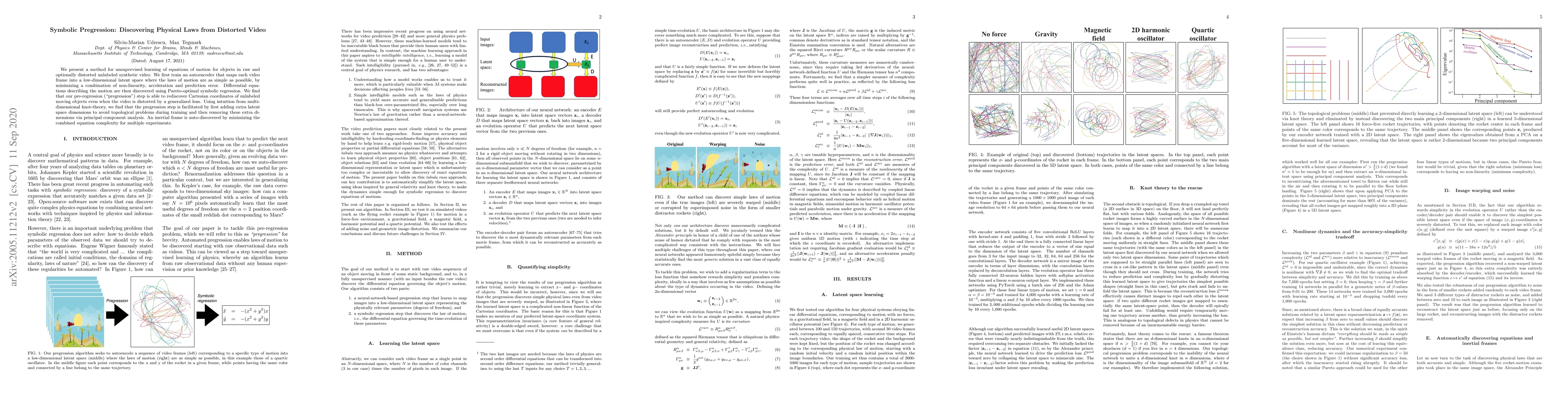 Researchers develop a method to discover physical laws from distorted video using autoencoders and Pareto-optimal symbolic regression. They successfully recover the Cartesian coordinates of moving objects even in distorted video.