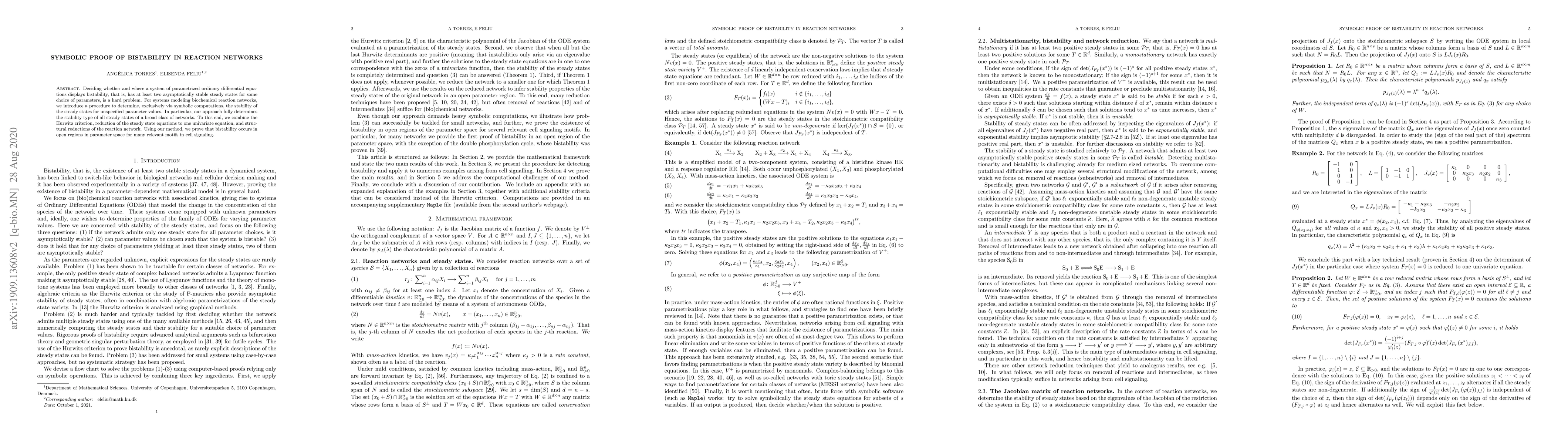 Researchers developed a method to determine stability of steady states in biochemical reaction networks using symbolic computations, revealing bistability occurs in open regions of parameter space for many cell signaling motifs.