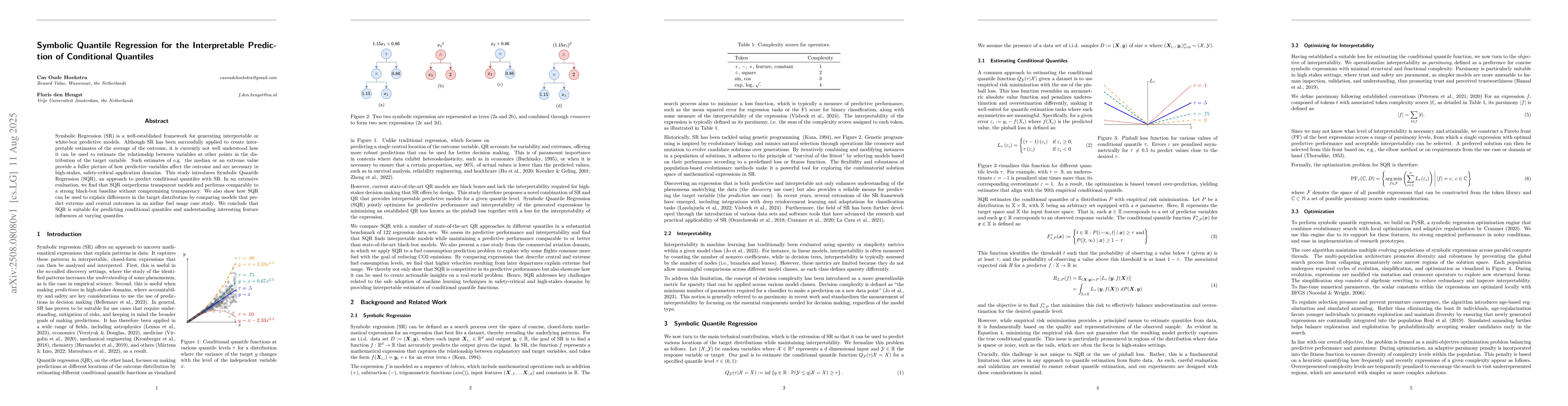 The research introduces Symbolic Quantile Regression (SQR), a method combining Symbolic Regression (SR) with Quantile Regression (QR) to produce interpretable predictors of conditional quantiles. It employs an extensive benchmark to evaluate SQR's competitive accuracy at median and upper quantiles, outperforming related methods across predictive performance, empirical calibration, and interpretability metrics.