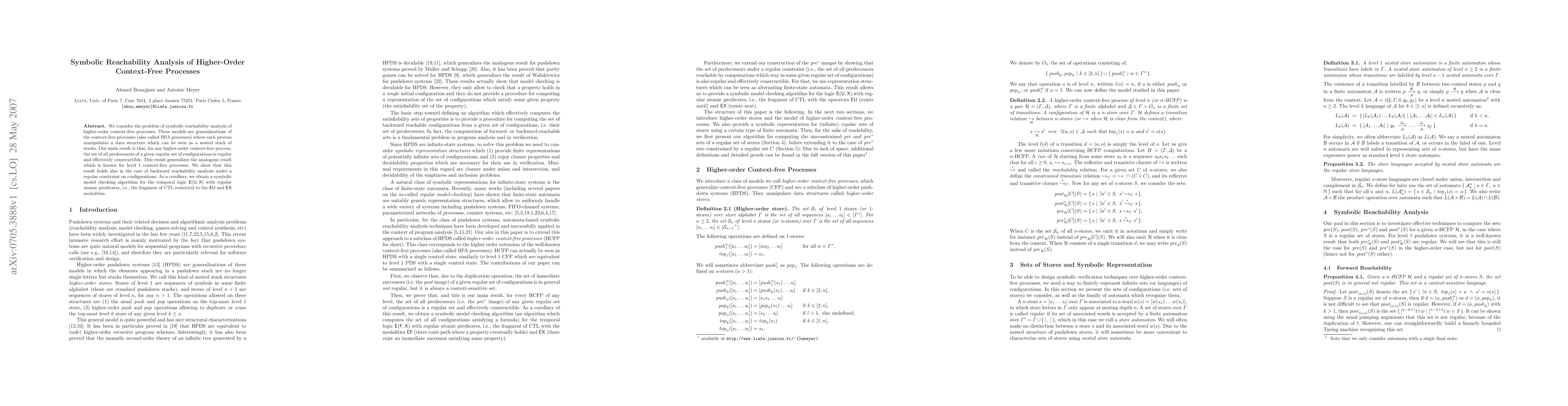 We consider the problem of symbolic reachability analysis of higher-order context-free processes. These models are generalizations of the context-free processes (also called BPA processes) where each process manipulates a data structure which can be seen as a nested stack of stacks. Our main result is that, for any higher-order context-free process, the set of all predecessors of a given regular set of configurations is regular and effectively constructible. This result generalizes the analogous result which is known for level 1 context-free processes. We show that this result holds also in the case of backward reachability analysis under a regular constraint on configurations. As a corollary, we obtain a symbolic model checking algorithm for the temporal logic E(U,X) with regular atomic predicates, i.e., the fragment of CTL restricted to the EU and EX modalities.