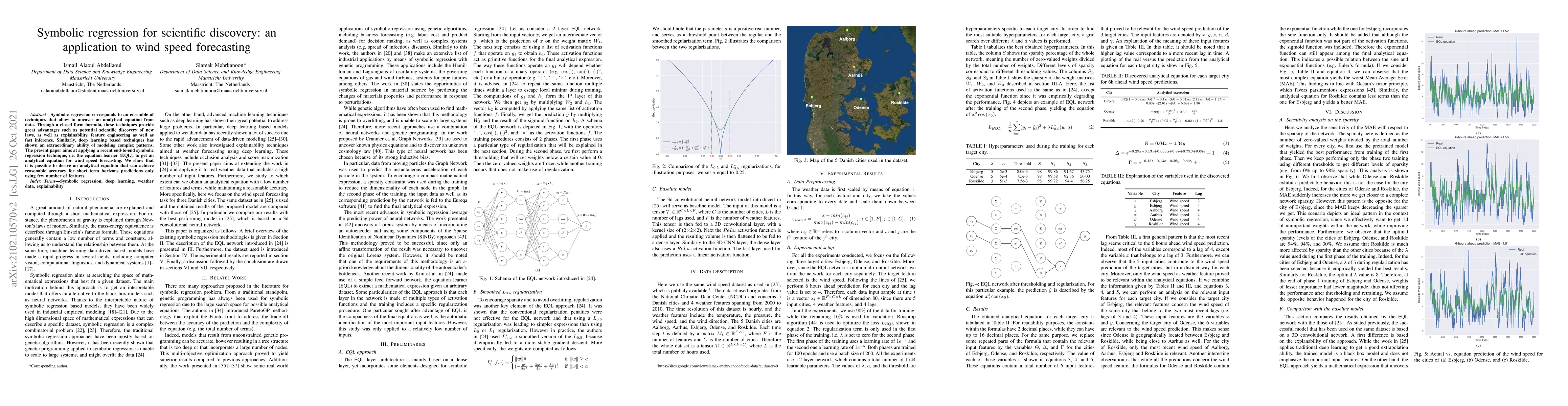 This paper applies symbolic regression, specifically the EQL technique, to derive an analytical equation for wind speed forecasting, demonstrating its potential for scientific discovery and explainability while achieving reasonable accuracy using a limited number of features.