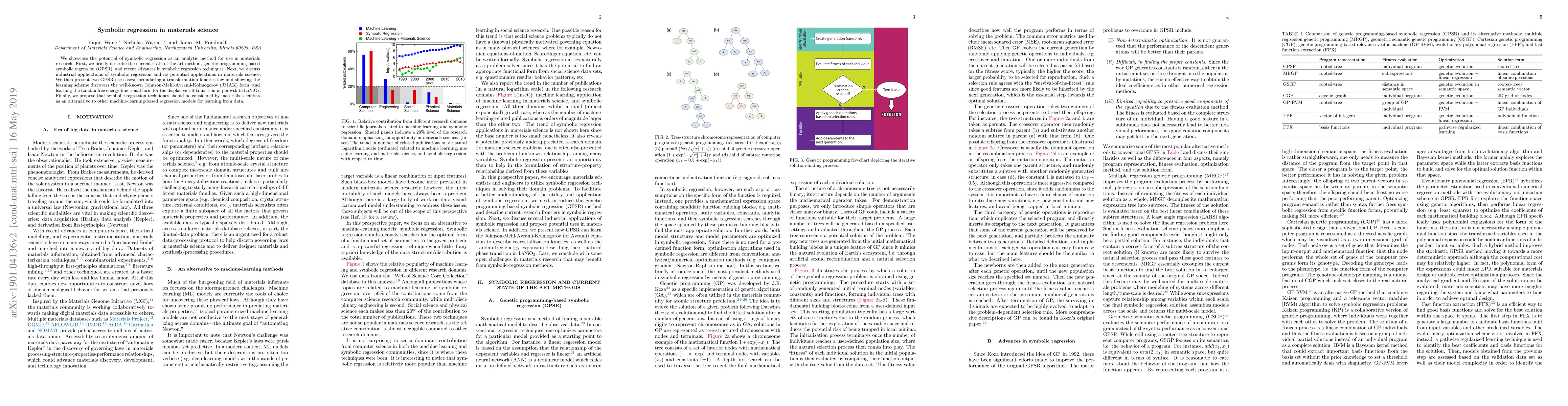 Symbolic regression, particularly genetic programming-based symbolic regression (GPSR), is proposed as a powerful analytic tool for materials science, exemplified by its application in deriving transformation kinetics laws and identifying functional forms in perovskite materials. Researchers should consider GPSR as an alternative to traditional machine-learning models for data-driven insights in materials research.