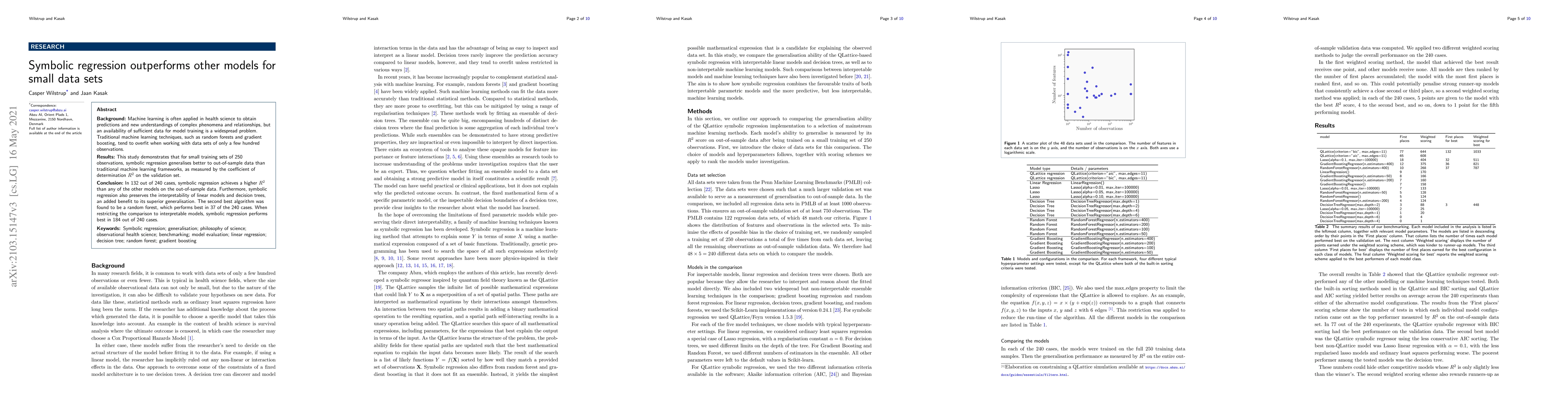 This study shows that symbolic regression outperforms traditional machine learning methods like random forests and gradient boosting in generalizing to small datasets, achieving higher R2 scores in 132 out of 240 cases. Symbolic regression also maintains interpretability, leading in 184 out of 240 cases when compared to interpretable models.