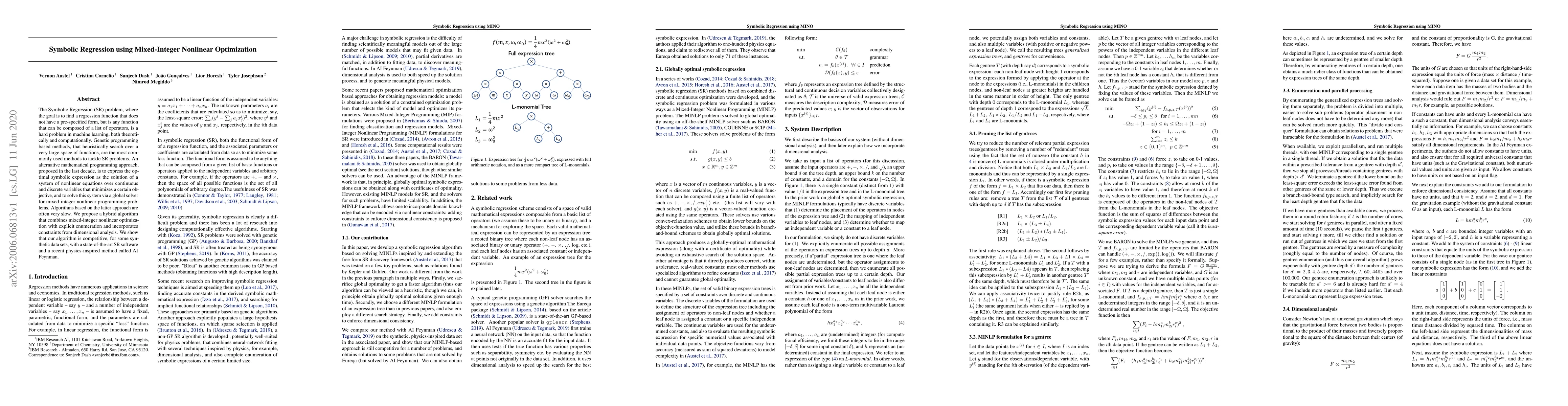 The Symbolic Regression (SR) problem, where the goal is to find a regression function that does not have a pre-specified form but is any function that can be composed of a list of operators, is a hard problem in machine learning, both theoretically and computationally. Genetic programming based methods, that heuristically search over a very large space of functions, are the most commonly used methods to tackle SR problems. An alternative mathematical programming approach, proposed in the last decade, is to express the optimal symbolic expression as the solution of a system of nonlinear equations over continuous and discrete variables that minimizes a certain objective, and to solve this system via a global solver for mixed-integer nonlinear programming problems. Algorithms based on the latter approach are often very slow. We propose a hybrid algorithm that combines mixed-integer nonlinear optimization with explicit enumeration and incorporates constraints from dimensional analysis. We show that our algorithm is competitive, for some synthetic data sets, with a state-of-the-art SR software and a recent physics-inspired method called AI Feynman.