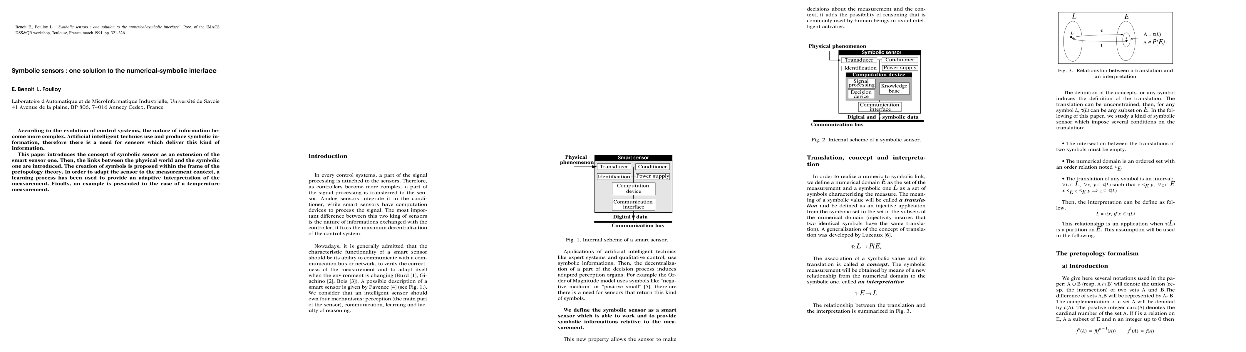 This paper introduces the concept of symbolic sensor as an extension of the smart sensor one. Then, the links between the physical world and the symbolic one are introduced. The creation of symbols is proposed within the frame of the pretopology theory. In order to adapt the sensor to the measurement context, a learning process has been used to provide an adaptive interpretation of the measurement. Finally, an example is presented in the case of a temperature measurement.
