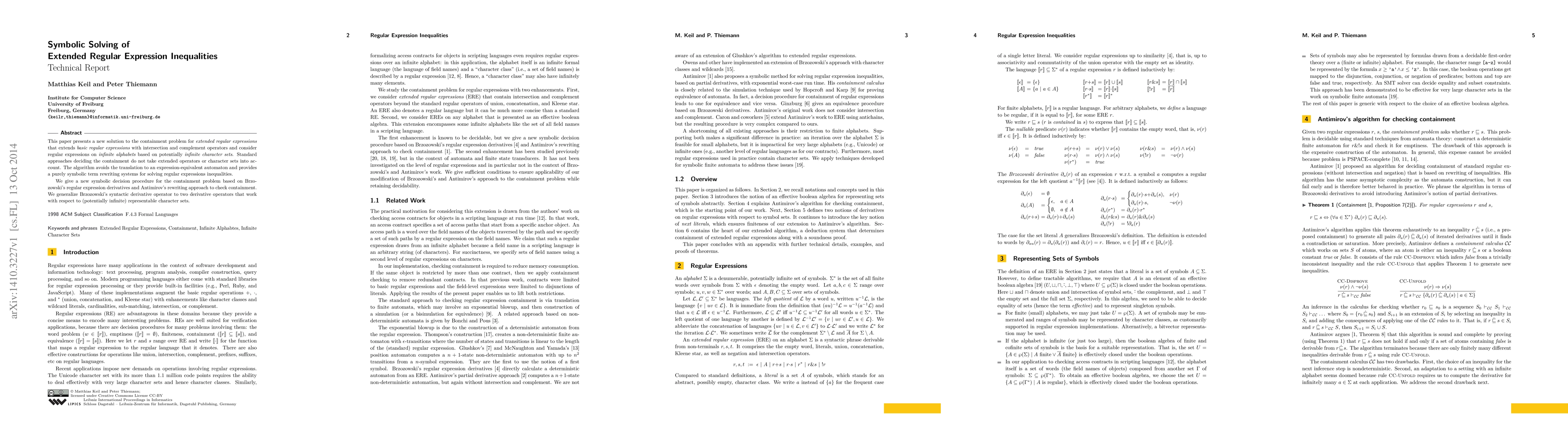 This paper presents a new solution to the containment problem for extended regular expressions that extends basic regular expressions with intersection and complement operators and consider regular expressions on infinite alphabets based on potentially infinite character sets. Standard approaches deciding the containment do not take extended operators or character sets into account. The algorithm avoids the translation to an expression-equivalent automaton and provides a purely symbolic term rewriting systems for solving regular expressions inequalities. We give a new symbolic decision procedure for the containment problem based on Brzozowski's regular expression derivatives and Antimirov's rewriting approach to check containment. We generalize Brzozowski's syntactic derivative operator to two derivative operators that work with respect to (potentially infinite) representable character sets.