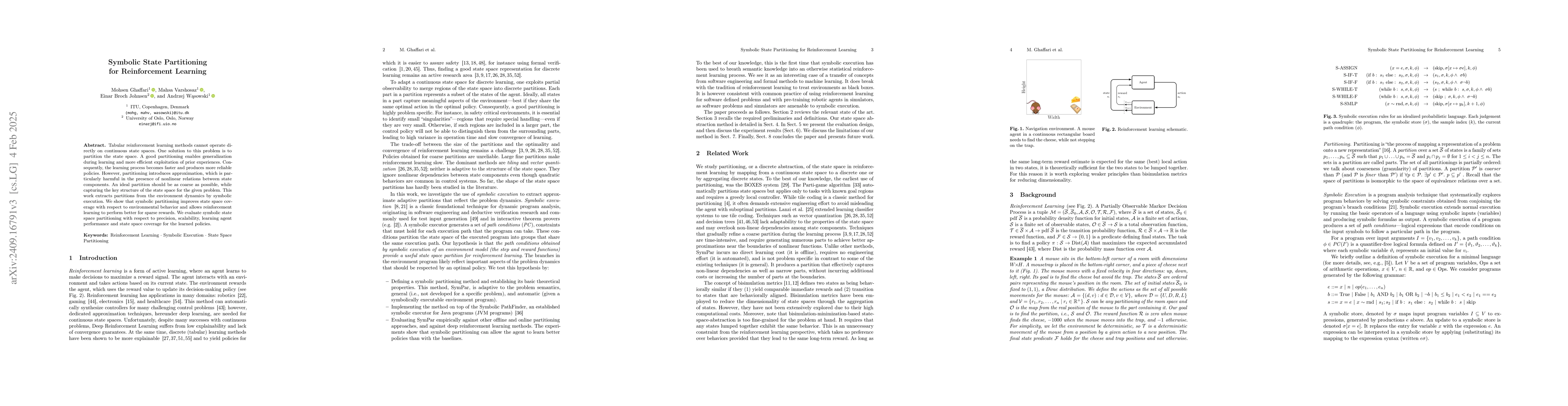 This paper proposes symbolic state partition techniques to enhance reinforcement learning in continuous state spaces by extracting partitions from environment dynamics through symbolic execution. The method aims to improve state space coverage and performance in reinforcement learning, especially for sparse rewards.