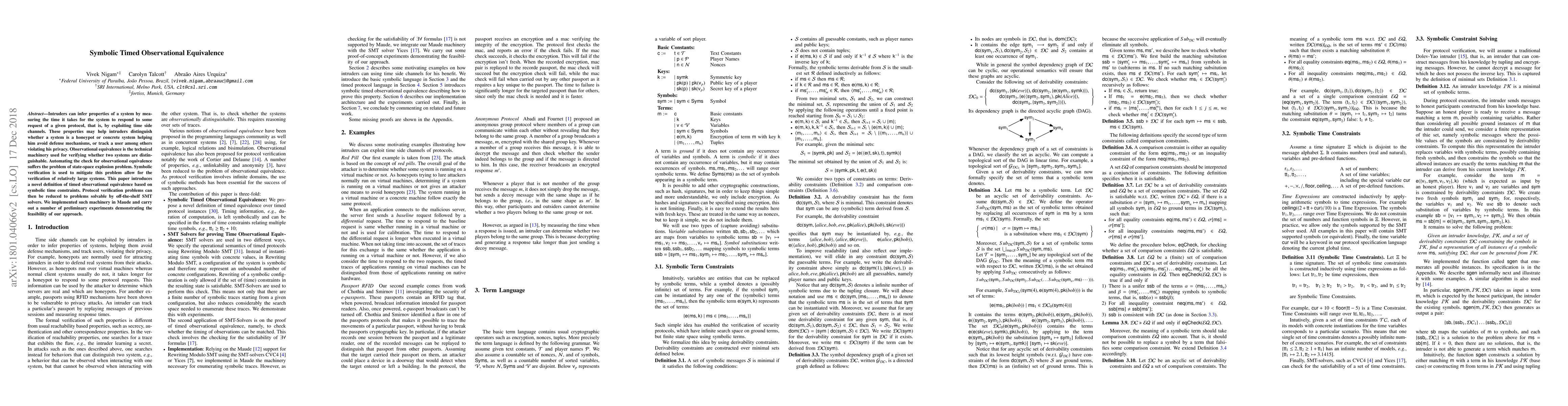 This paper introduces a novel definition of timed observational equivalence that accounts for time side channels, enabling the distinction between systems based on their response times. It leverages symbolic time constraints and SMT-solvers for automated verification.