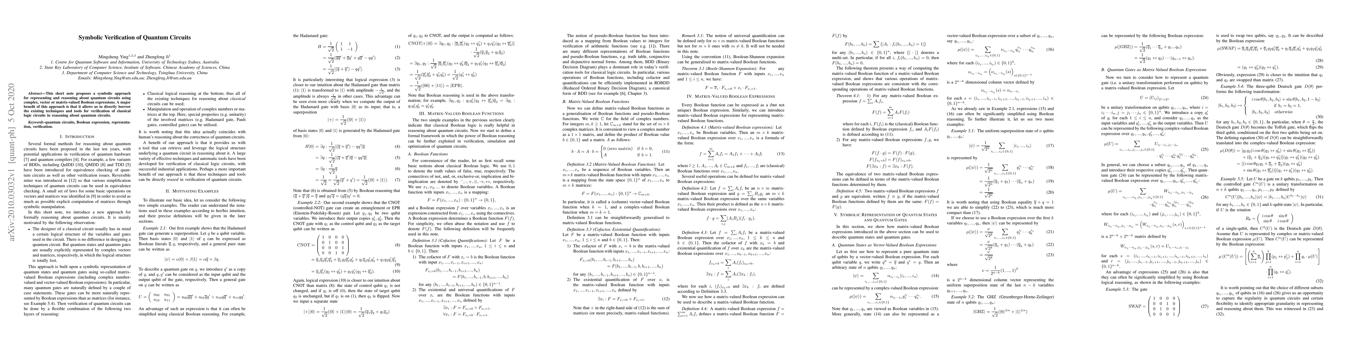 This paper introduces a symbolic method for quantum circuit verification utilizing complex, vector or matrix-based Boolean expressions, enabling the application of classical logic circuit verification techniques to quantum circuits.