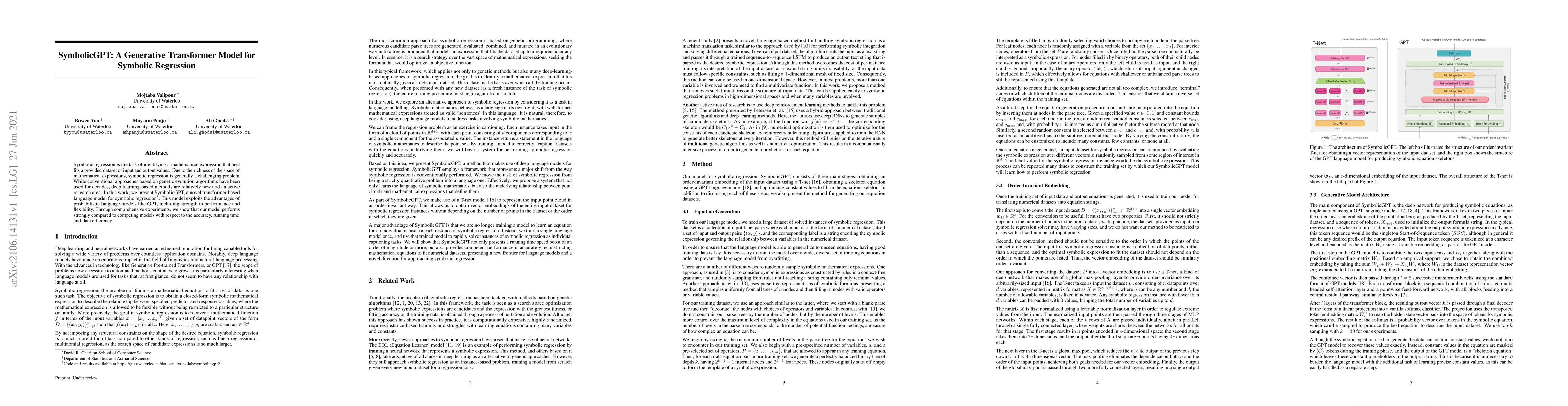 SymbolicGPT is a transformer-based language model designed for symbolic regression, demonstrating superior performance, speed, and data efficiency compared to traditional and other deep learning methods. The model leverages the strengths of probabilistic language models to effectively identify mathematical expressions that best fit given datasets.