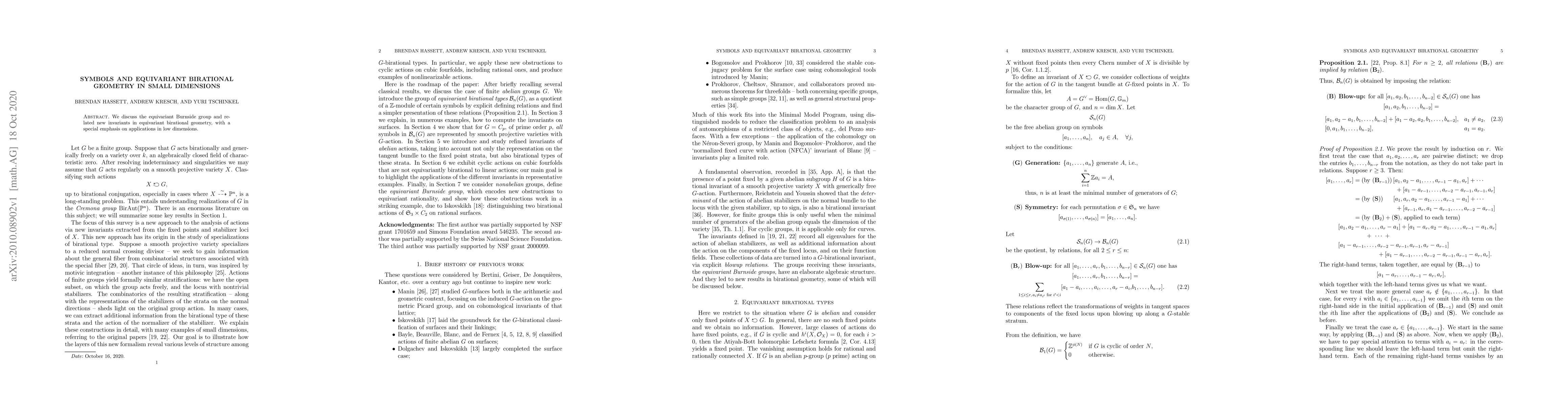 We discuss the equivariant Burnside group and related new invariants in equivariant birational geometry, with a special emphasis on applications in low dimensions.