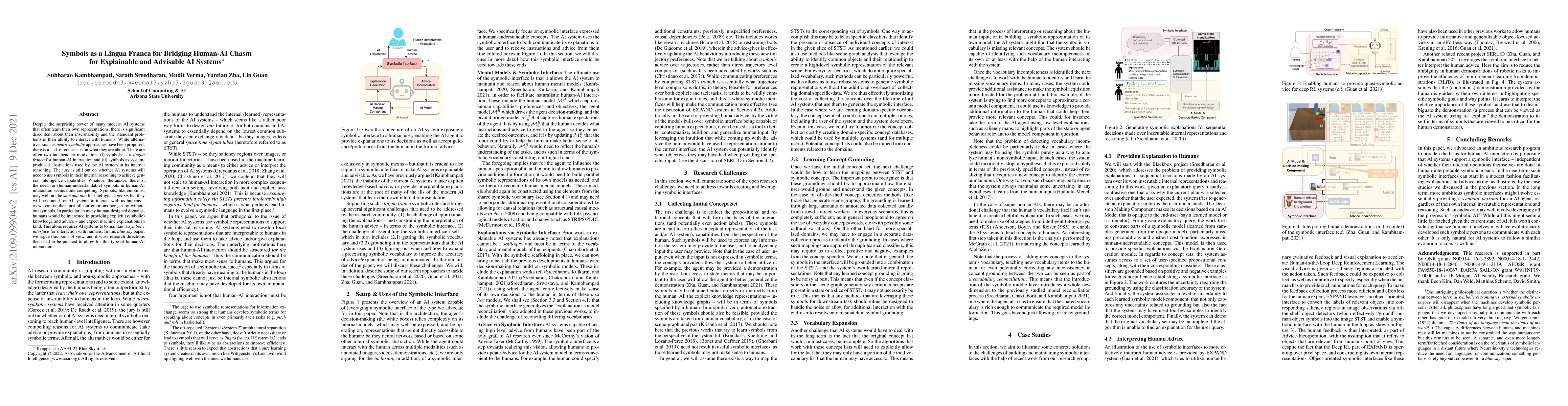 Despite the surprising power of many modern AI systems that often learn their own representations, there is significant discontent about their inscrutability and the attendant problems in their ability to interact with humans. While alternatives such as neuro-symbolic approaches have been proposed, there is a lack of consensus on what they are about. There are often two independent motivations (i) symbols as a lingua franca for human-AI interaction and (ii) symbols as system-produced abstractions used by the AI system in its internal reasoning. The jury is still out on whether AI systems will need to use symbols in their internal reasoning to achieve general intelligence capabilities. Whatever the answer there is, the need for (human-understandable) symbols in human-AI interaction seems quite compelling. Symbols, like emotions, may well not be sine qua non for intelligence per se, but they will be crucial for AI systems to interact with us humans -- as we can neither turn off our emotions nor get by without our symbols. In particular, in many human-designed domains, humans would be interested in providing explicit (symbolic) knowledge and advice -- and expect machine explanations in kind. This alone requires AI systems to to maintain a symbolic interface for interaction with humans. In this blue sky paper, we argue this point of view, and discuss research directions that need to be pursued to allow for this type of human-AI interaction.