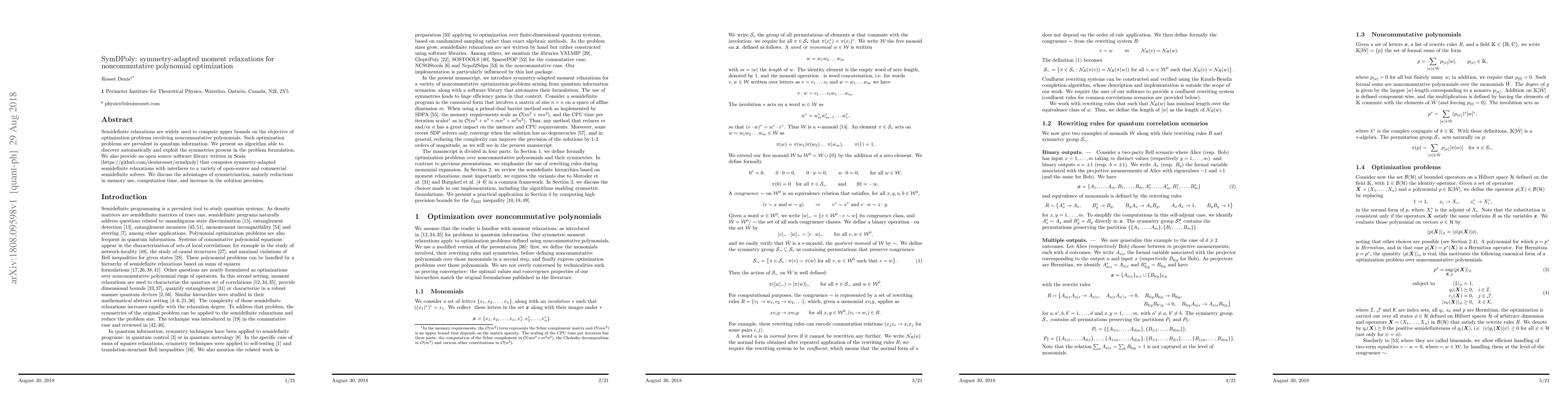 Semidefinite relaxations are widely used to compute upper bounds on the objective of optimization problems involving noncommutative polynomials. Such optimization problems are prevalent in quantum information. We present an algorithm able to discover automatically and exploit the symmetries present in the problem formulation. We also provide an open source software library written in Scala ( https://denisrosset.github.io/symdpoly ) that computes symmetry-adapted semidefinite relaxations with interfaces to a variety of open-source and commercial semidefinite solvers. We discuss the advantages of symmetrization, namely reductions in memory use, computation time, and increase in the solution precision.